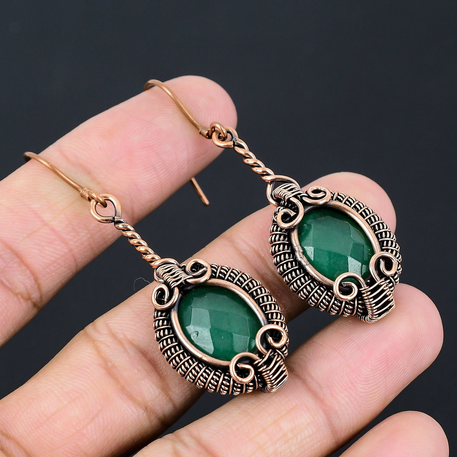 Elevate your style with these exquisite handcrafted earrings, featuring stunning green gemstones elegantly wrapped in copper wire.