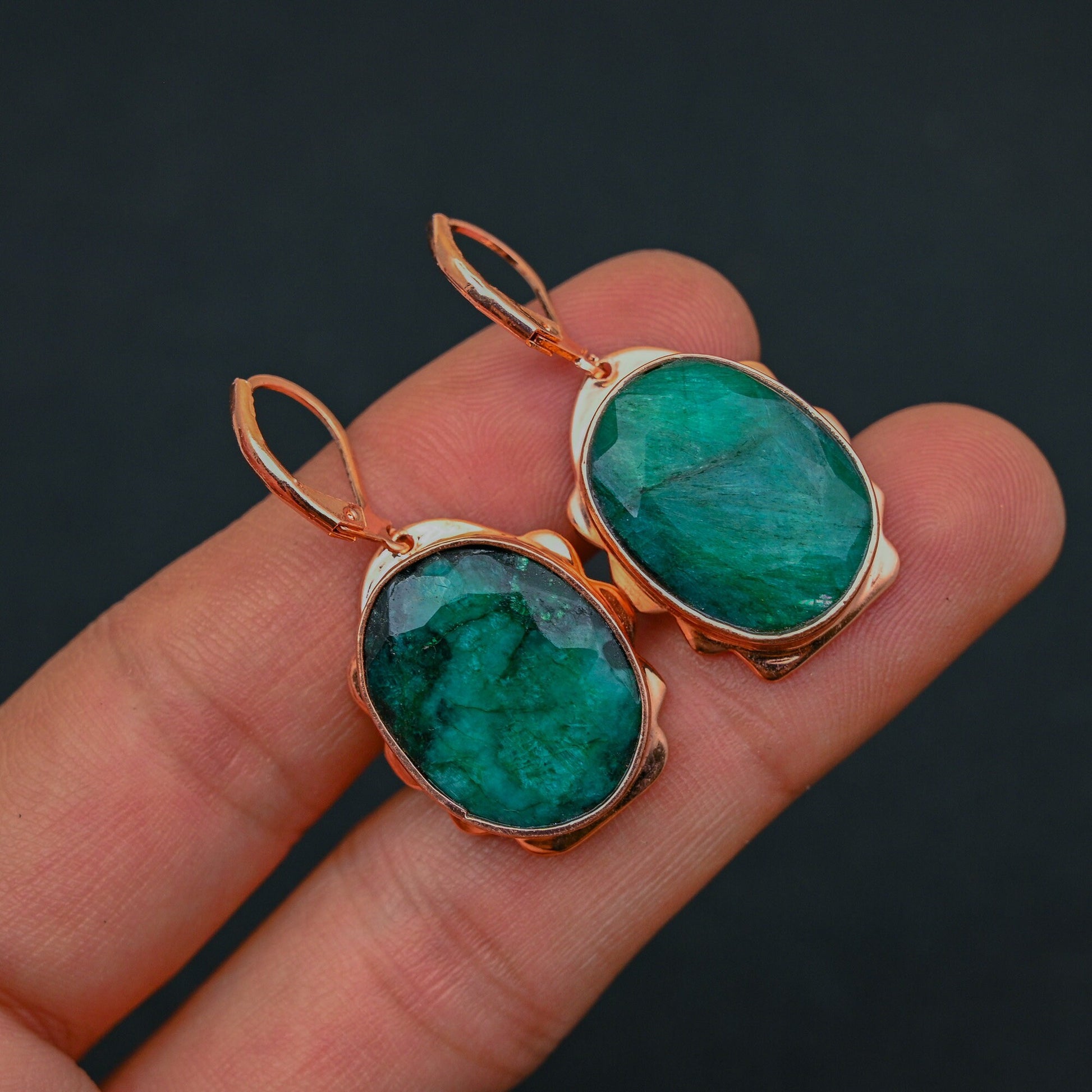 Crafted with care, each earring features a stunning oval-shaped emerald that glistens with a vivid green hue, set in a warm, rose-gold-toned frame.