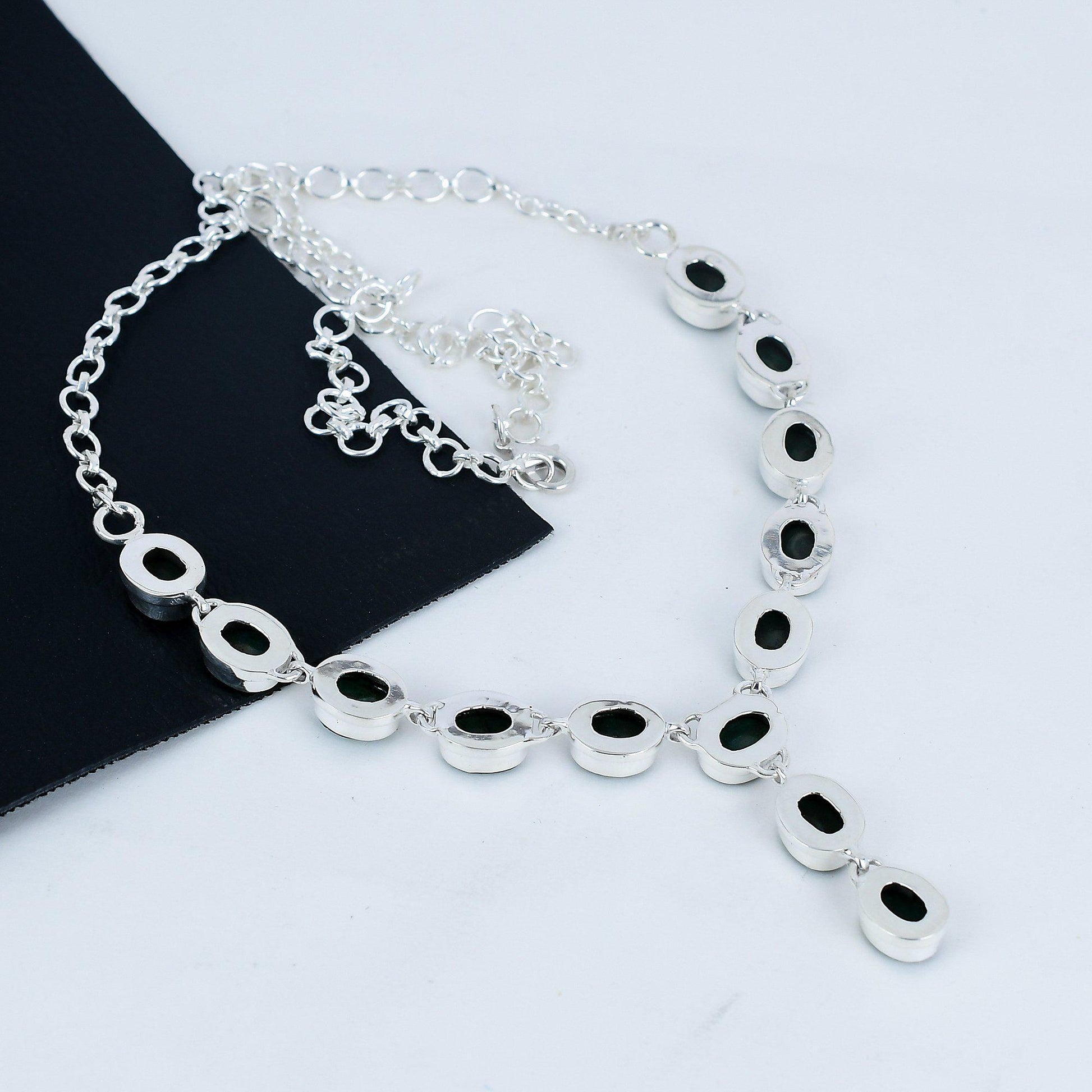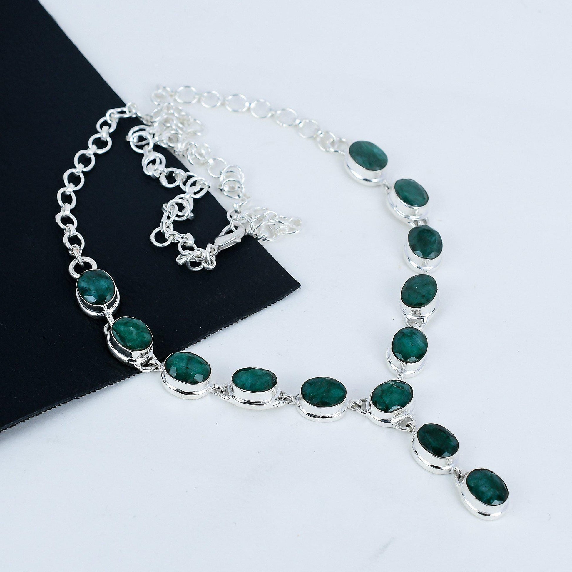 Indulge in the elegance of our exquisite emerald necklace, featuring a series of captivating oval green stones elegantly set in lustrous silver-toned chain links.