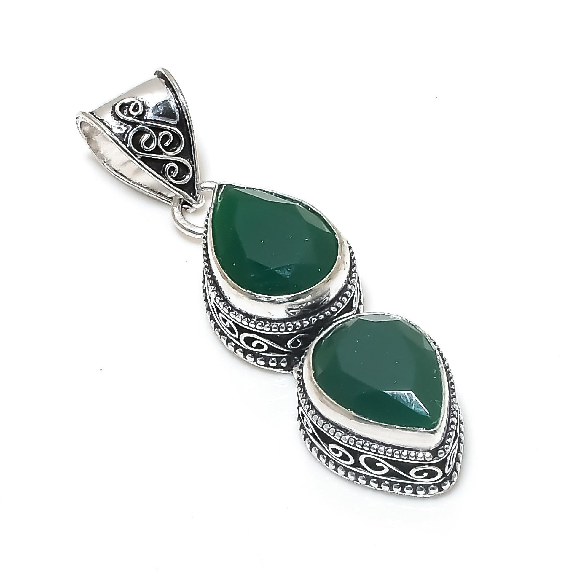 Enhance your style with this exquisite, handcrafted pendant featuring dual teardrop-shaped green gemstones, elegantly set in intricate silver detailing.