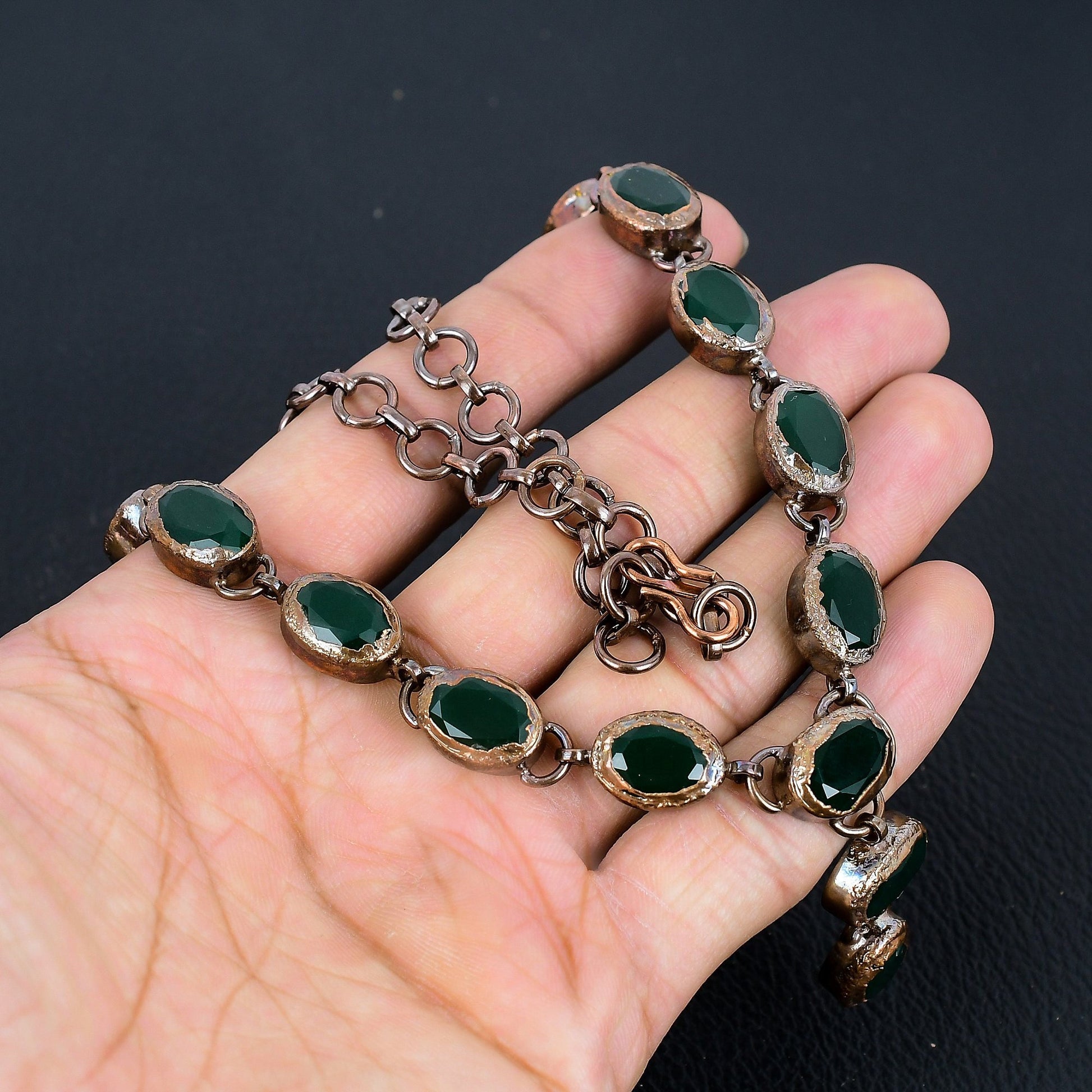 This unique piece features deep green oval gemstones that exude sophistication and allure. Each stone is intricately set in rustic, textured bezels to add a touch of antiquity and artistic craftsmanship.