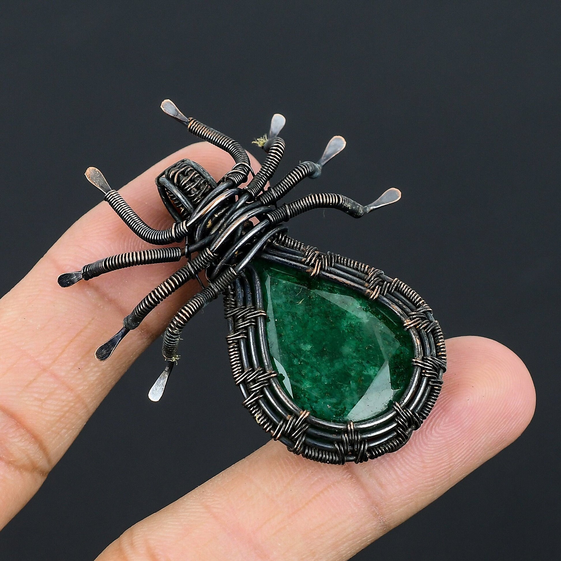 This exquisite piece features a stunning green gemstone encased within intricately woven wire resembling the delicate form of an arachnid.