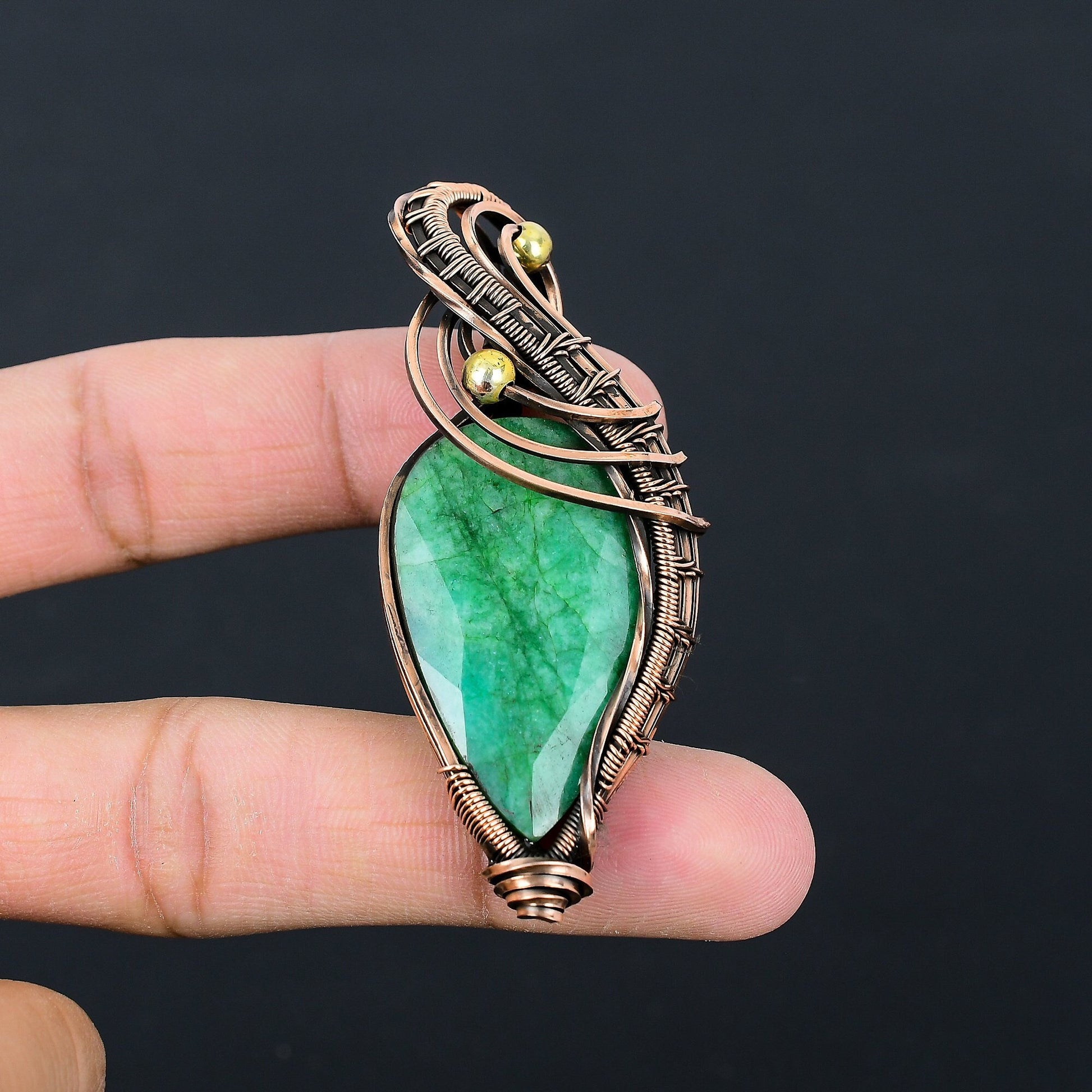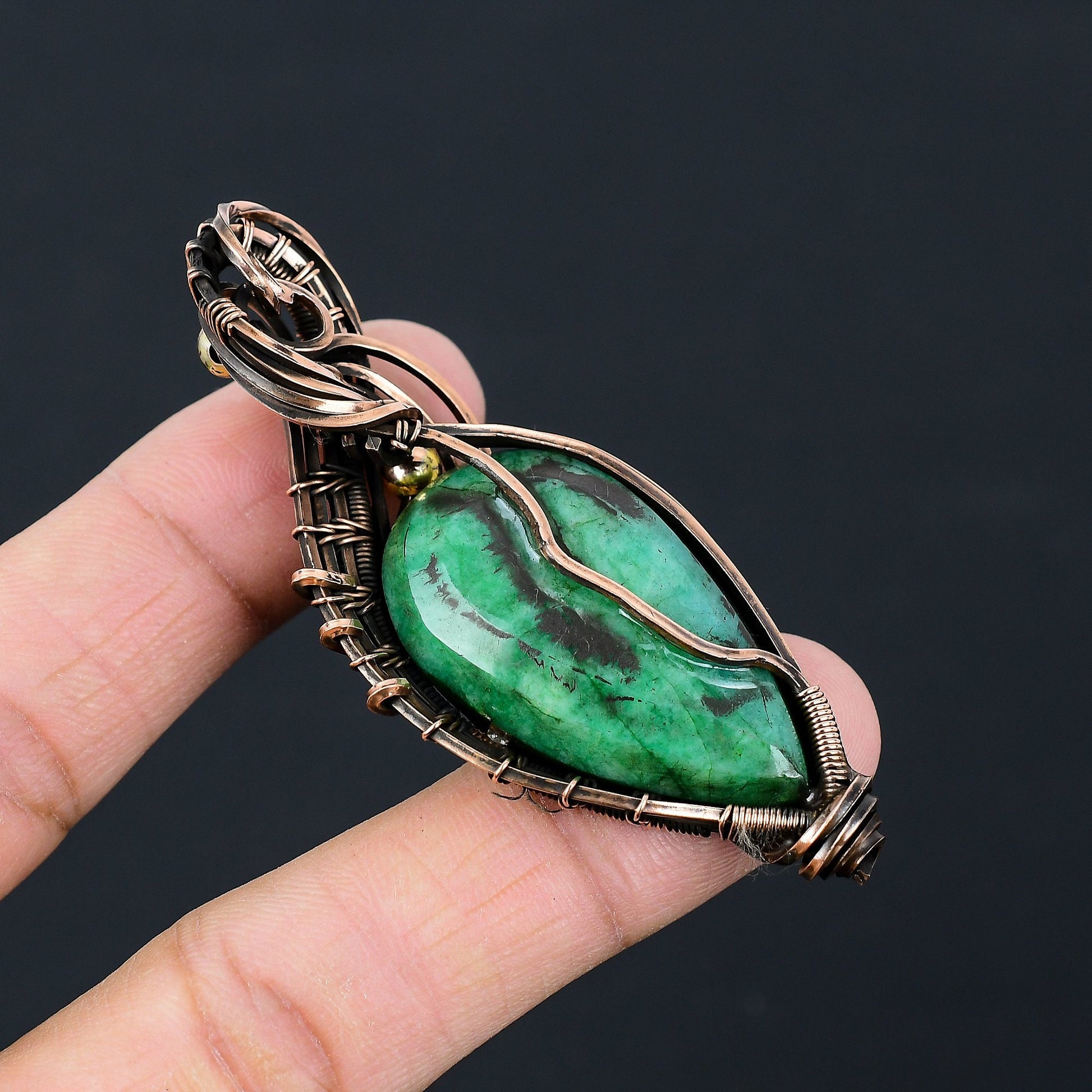 This striking pendant blends timeless craftsmanship with modern style, featuring a captivating green gemstone accentuated by expertly woven copper wire. The unique design is further highlighted by subtle golden embellishments.