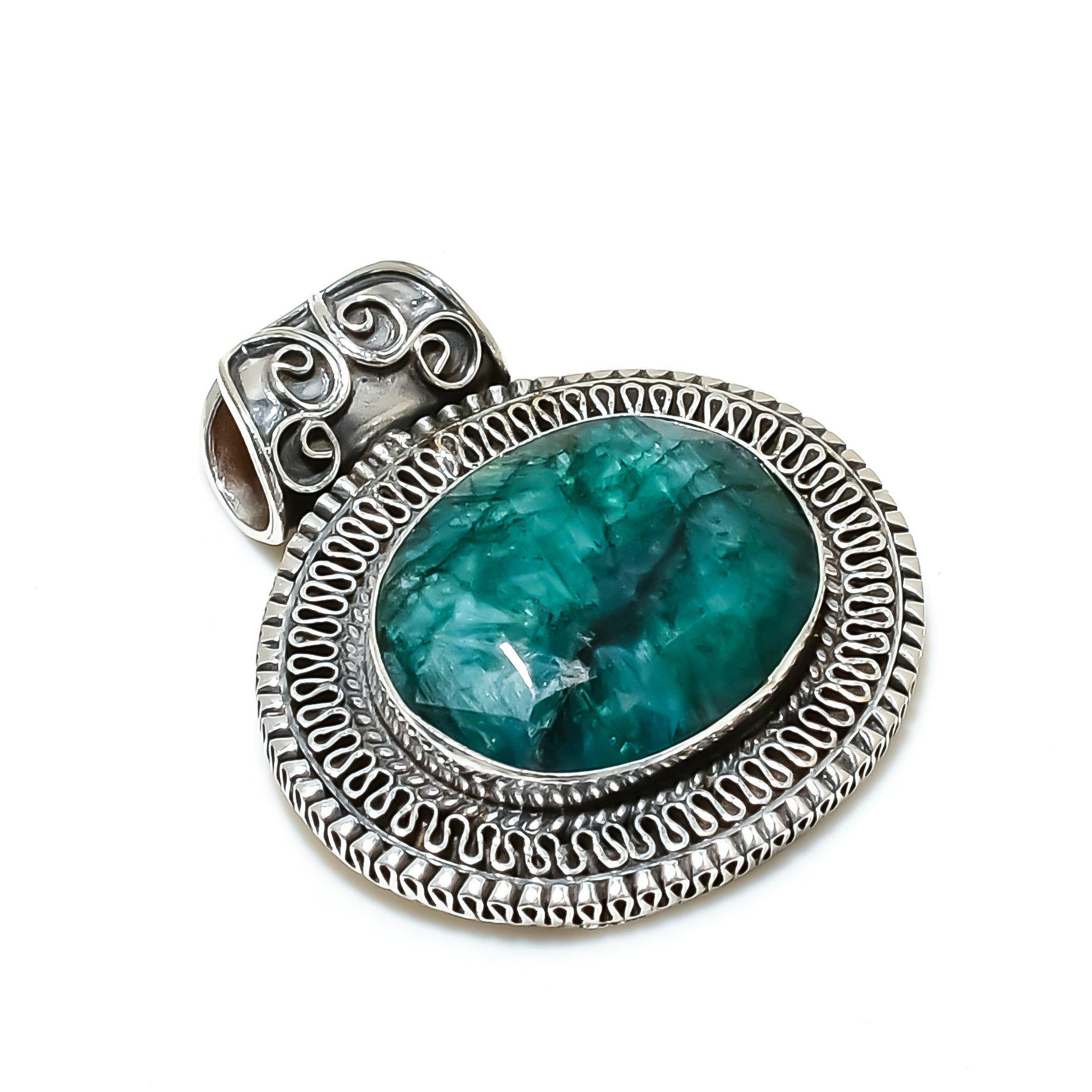 This stunning piece features an intricately crafted silver setting, highlighting the captivating, deep green hues of the emerald gemstone.