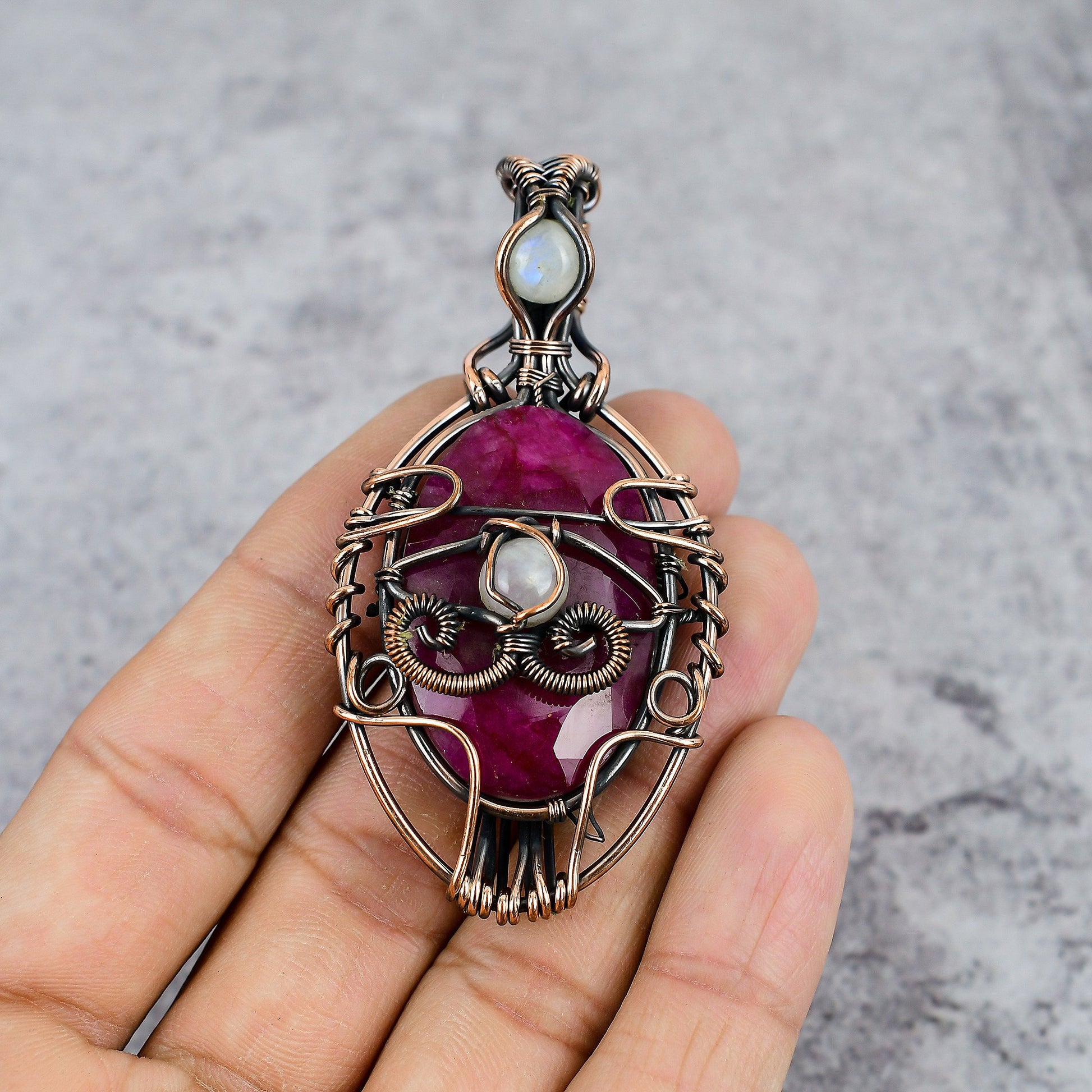 Material: Copper, Red Gemstone, Moonstone Accent