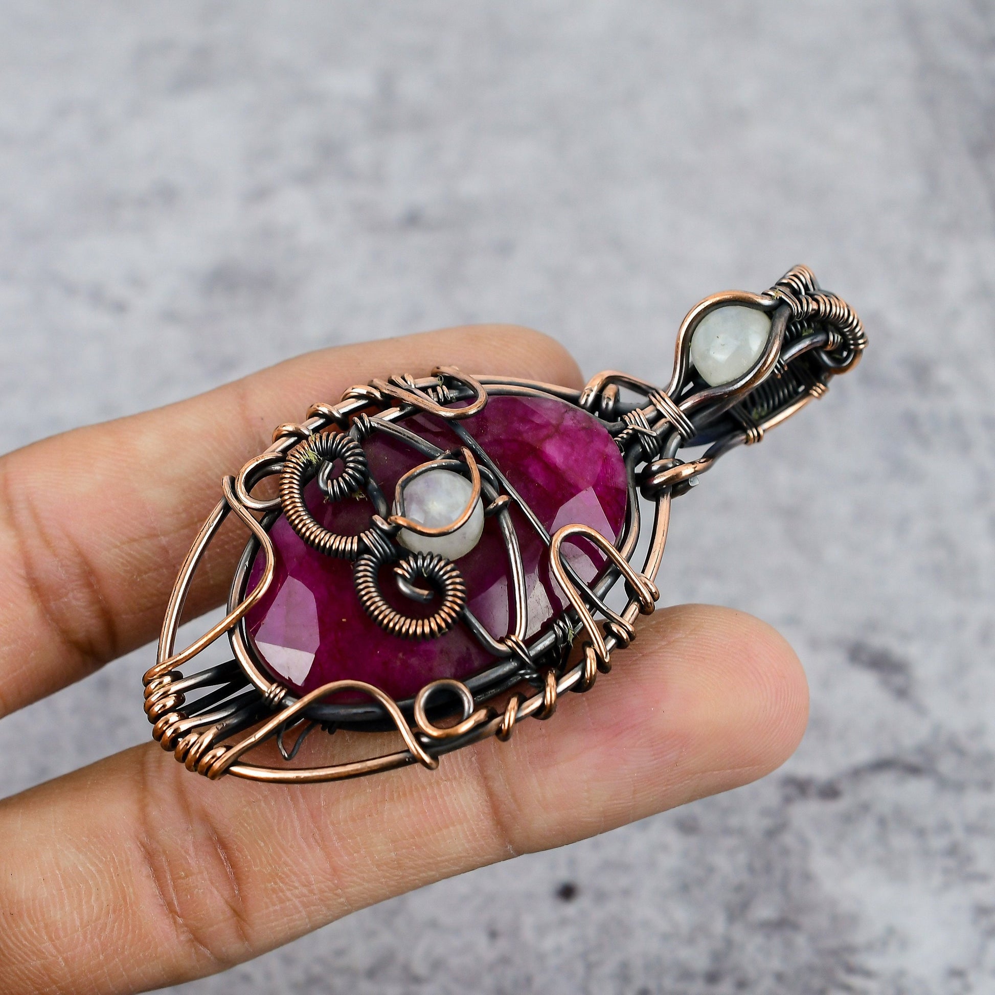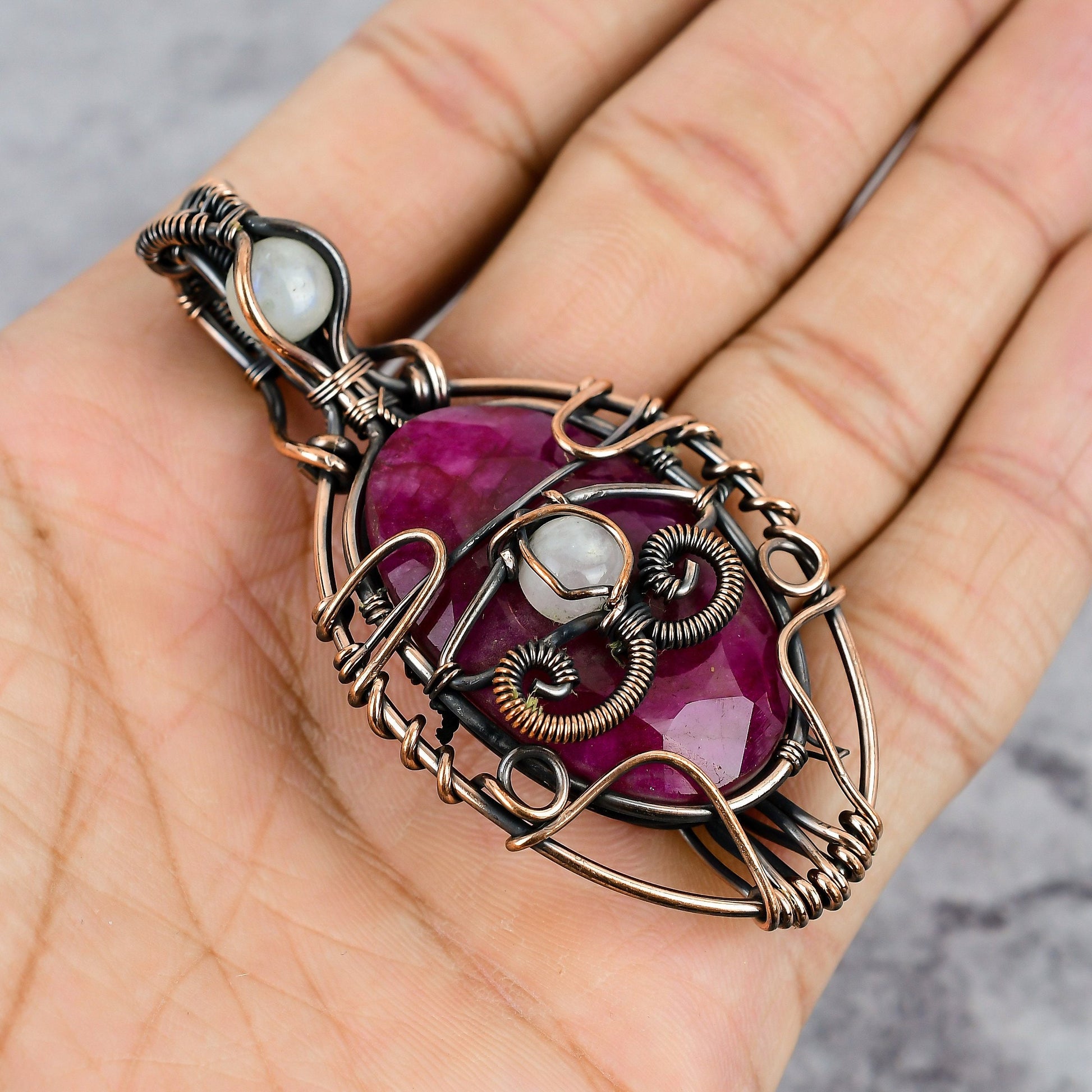 Discover the exquisite allure of our handcrafted wire-wrapped pendant, showcasing a mesmerizing red gemstone set in a beautiful copper frame.