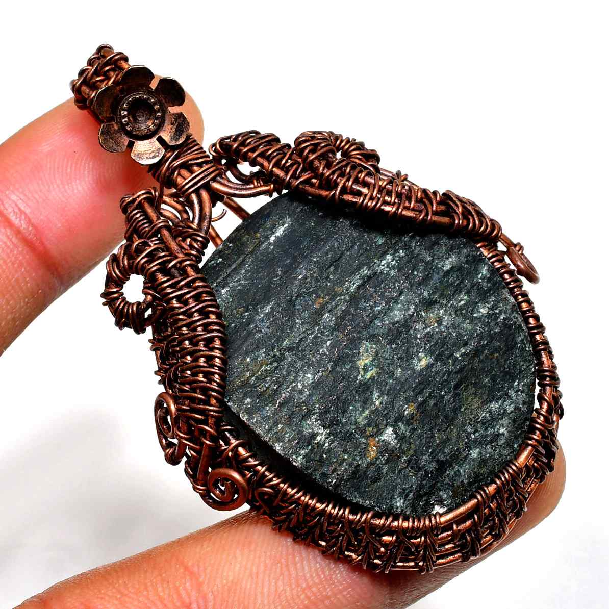 Ezra’s Veil is a handcrafted gemstone pendant wrapped in oxidized copper wire. Designed to exude natural beauty and rustic elegance, this piece speaks to those drawn to unique, earthy aesthetics.