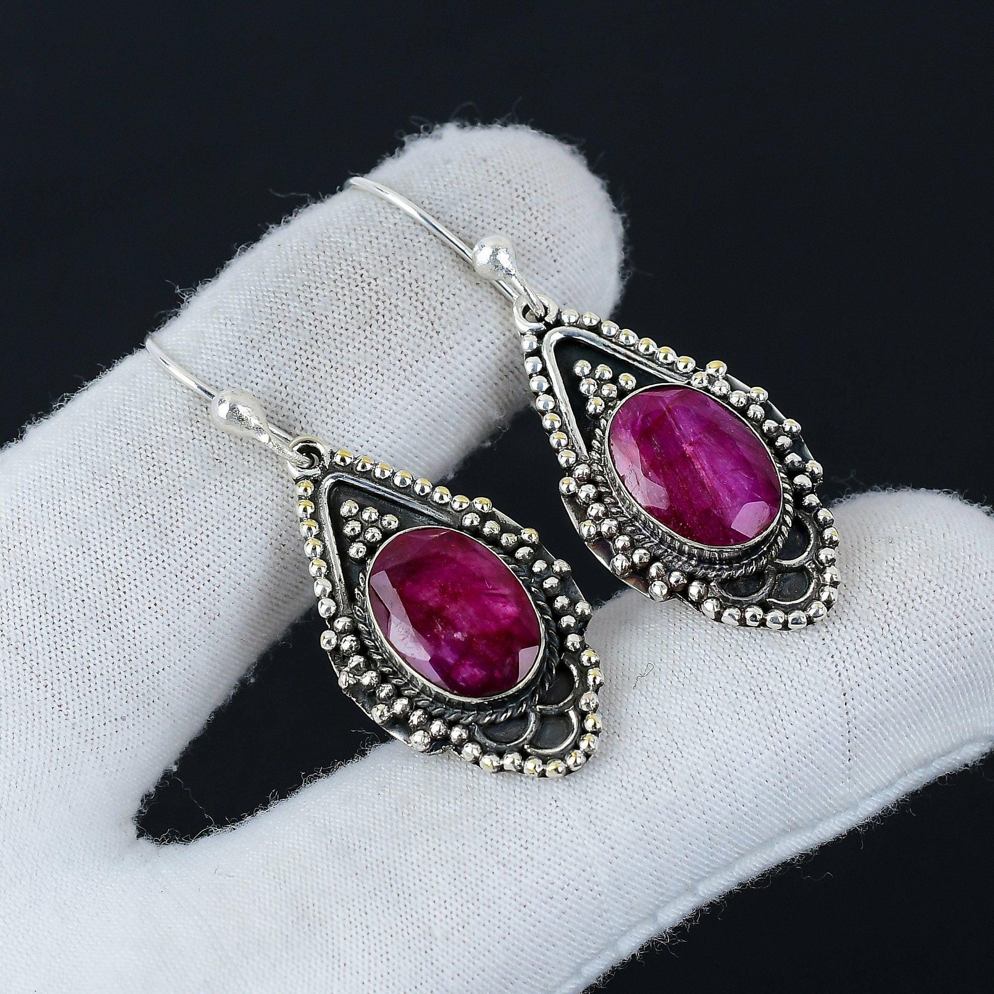 Experience elegance with these stunning handcrafted earrings. Featuring a captivating teardrop design, each piece showcases a vibrant magenta gemstone, artfully set in intricate silver detailing.