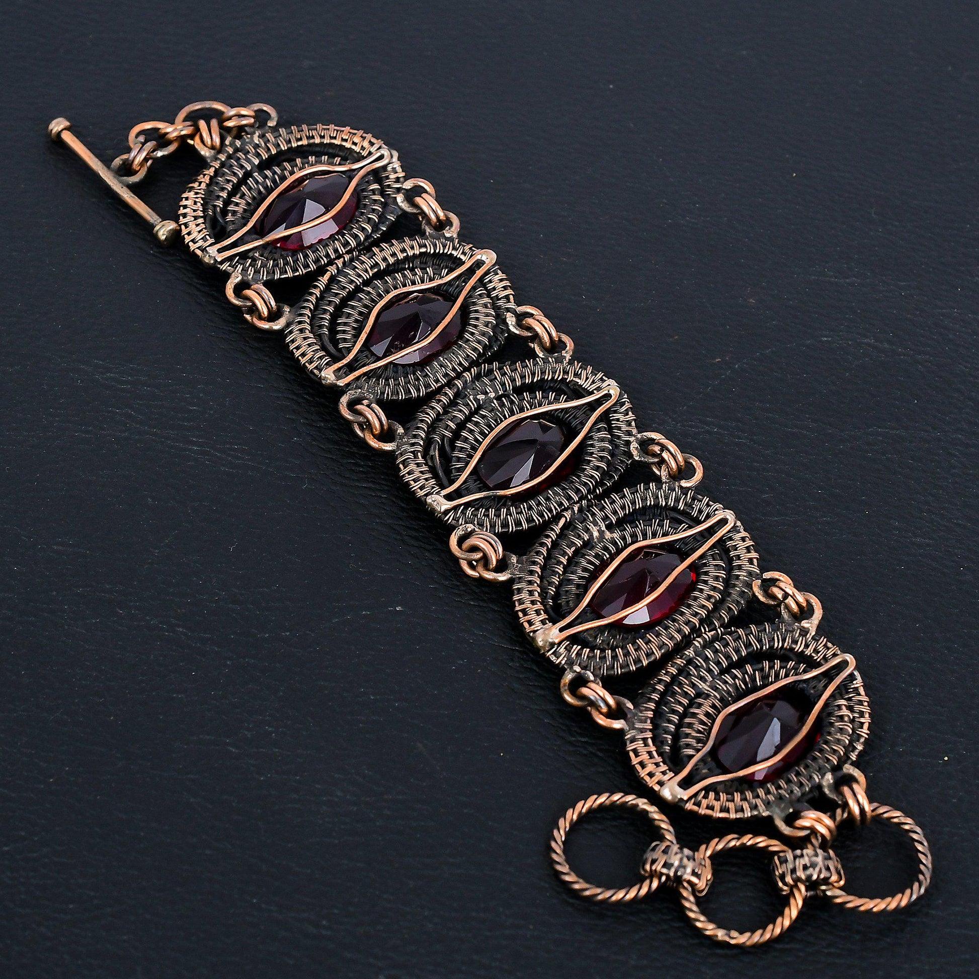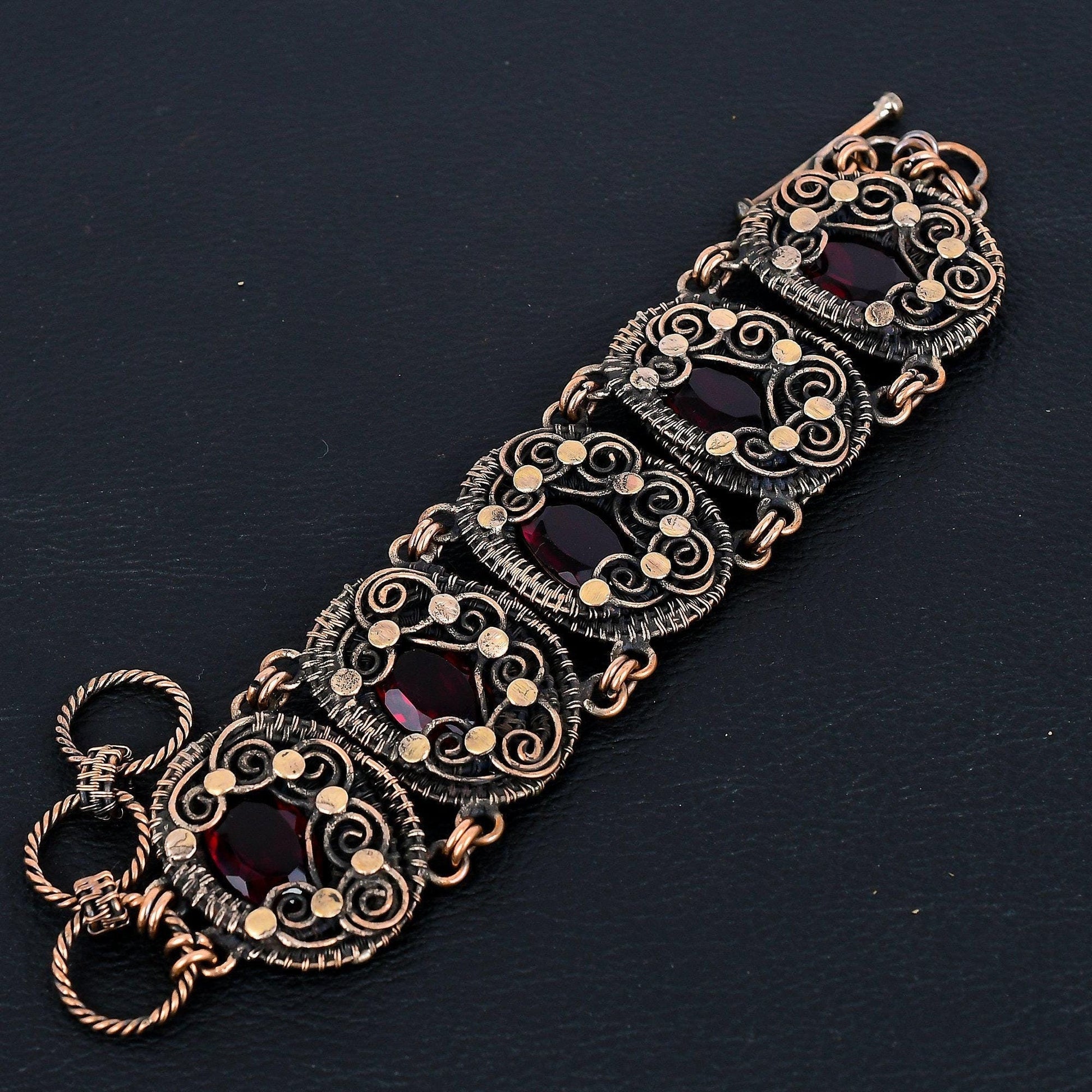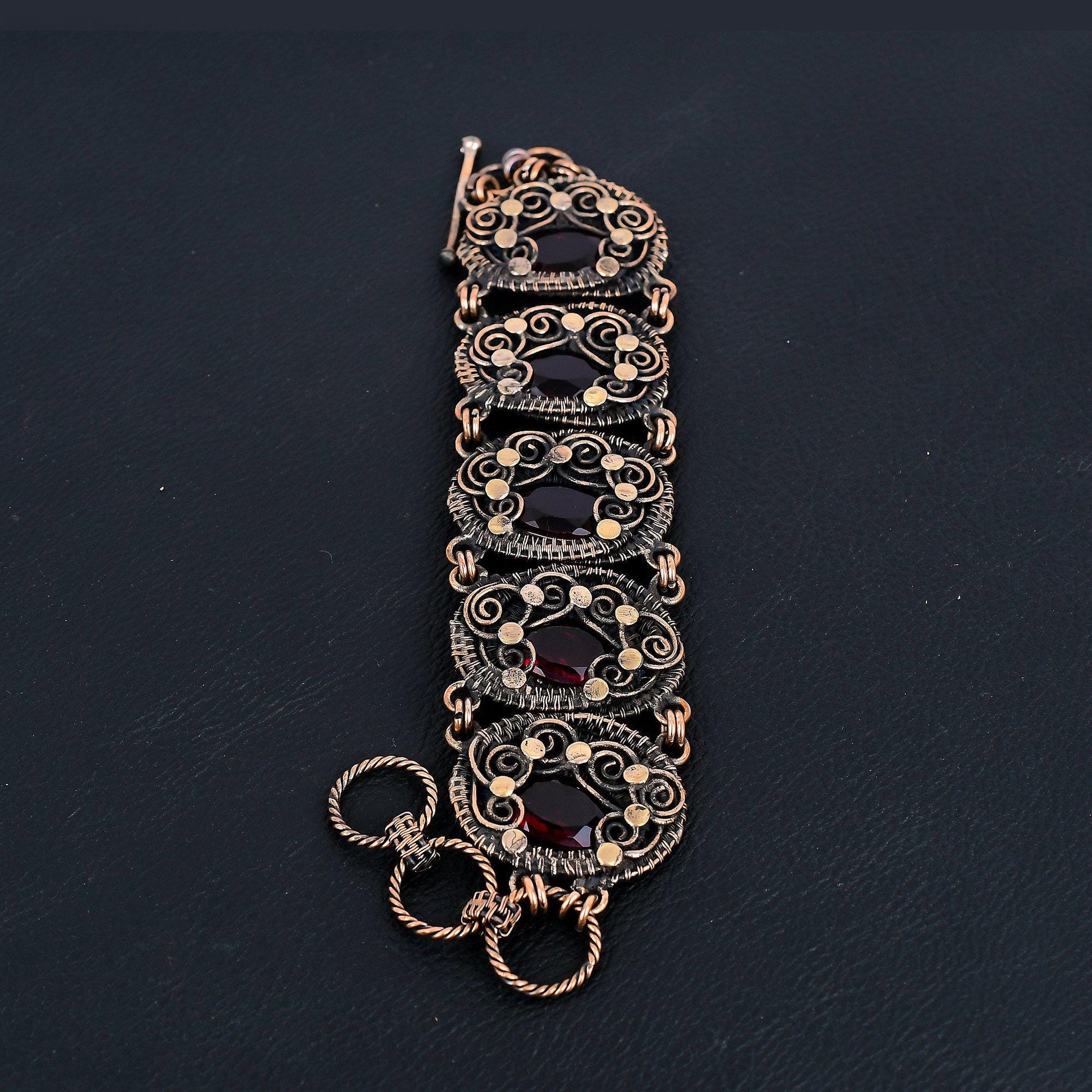 This stunning bracelet features intricate metalwork, with each link showcasing delicate wire detailing and embellishments that highlight the rich, dark tones of the copper.