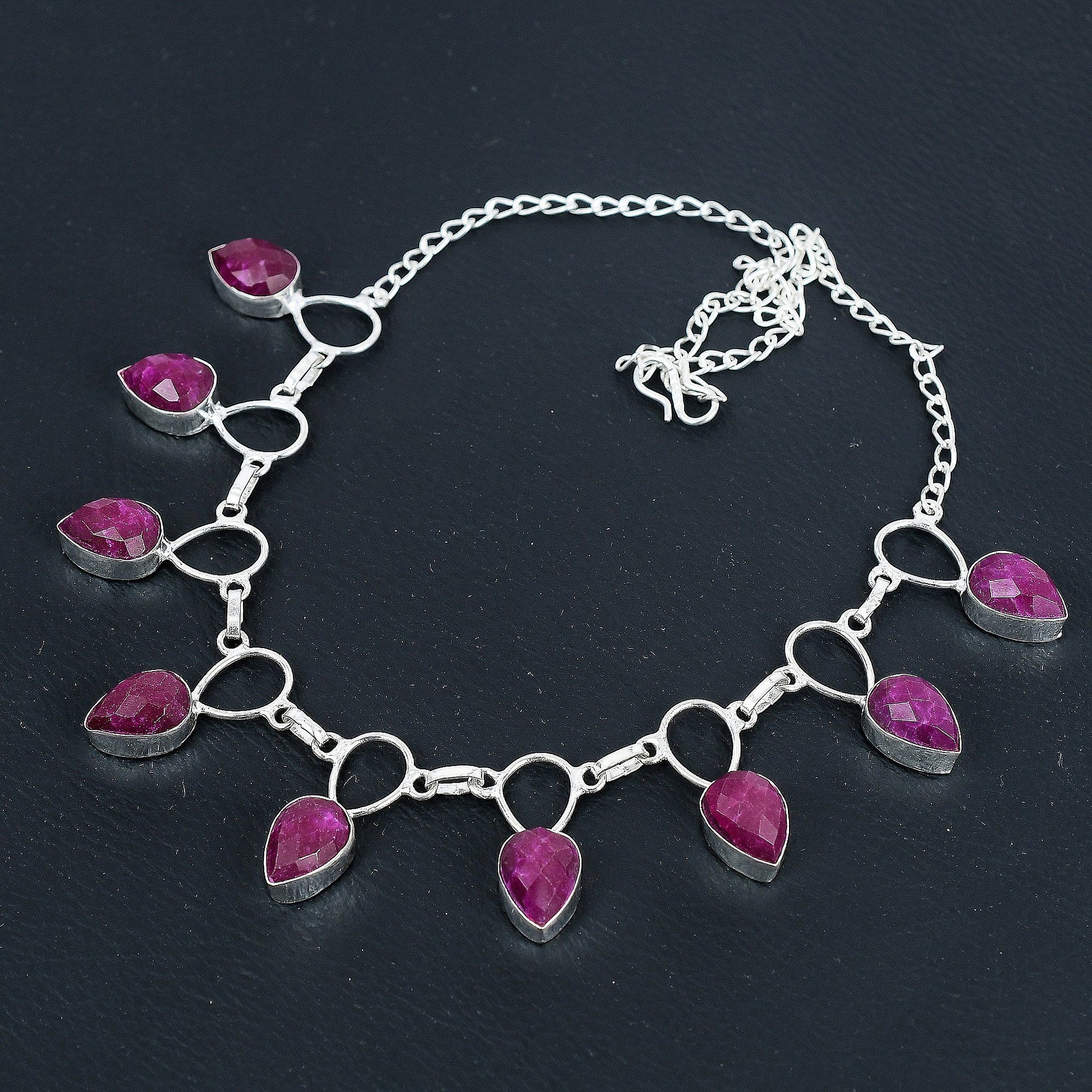 Design: The necklace showcases a sequence of vibrant ruby stones, each set in a beautifully crafted silver frame, adding a touch of sophistication and color to any attire.