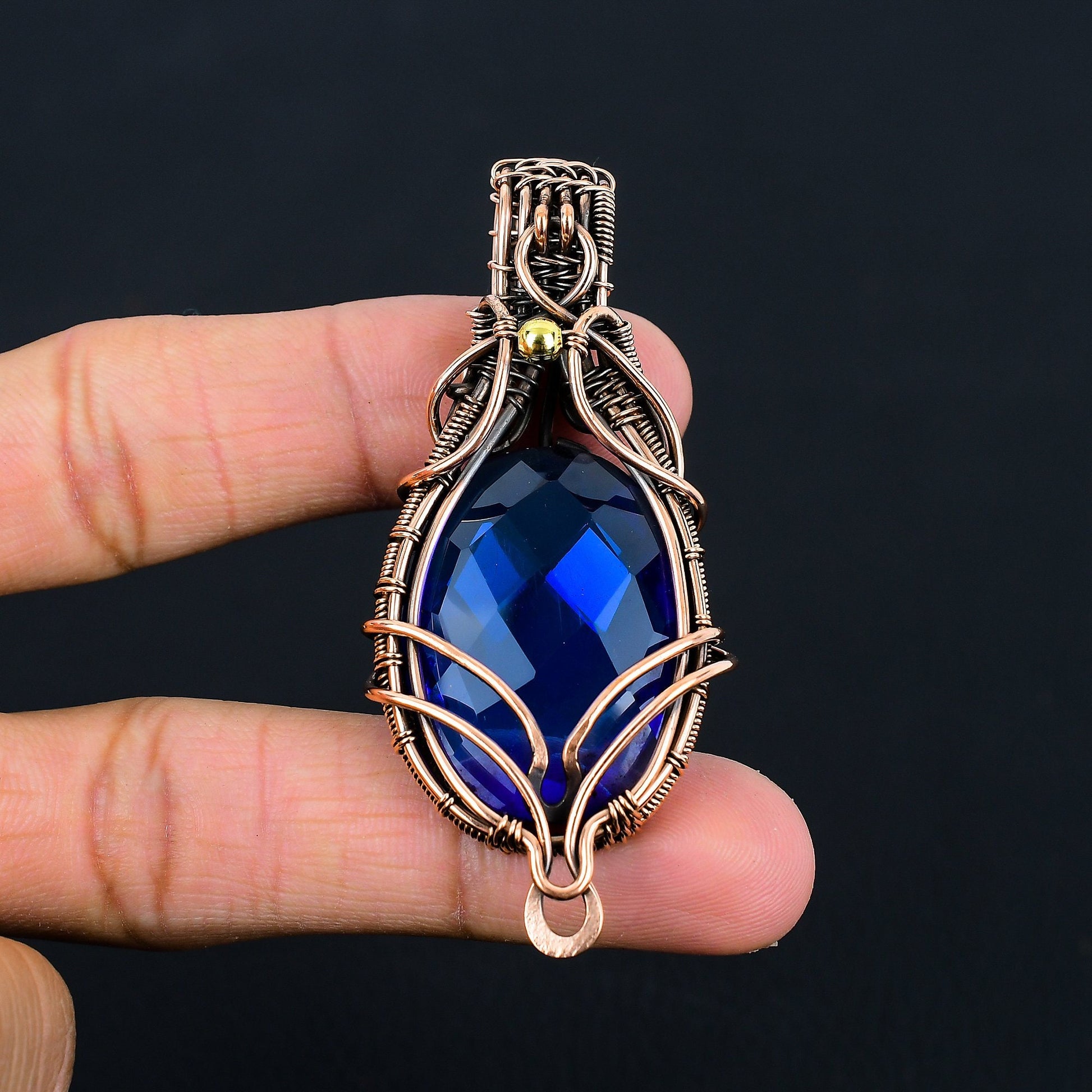 Introducing our exquisite handcrafted pendant, featuring a mesmerizing deep blue gemstone encased in an intricate copper wire design.