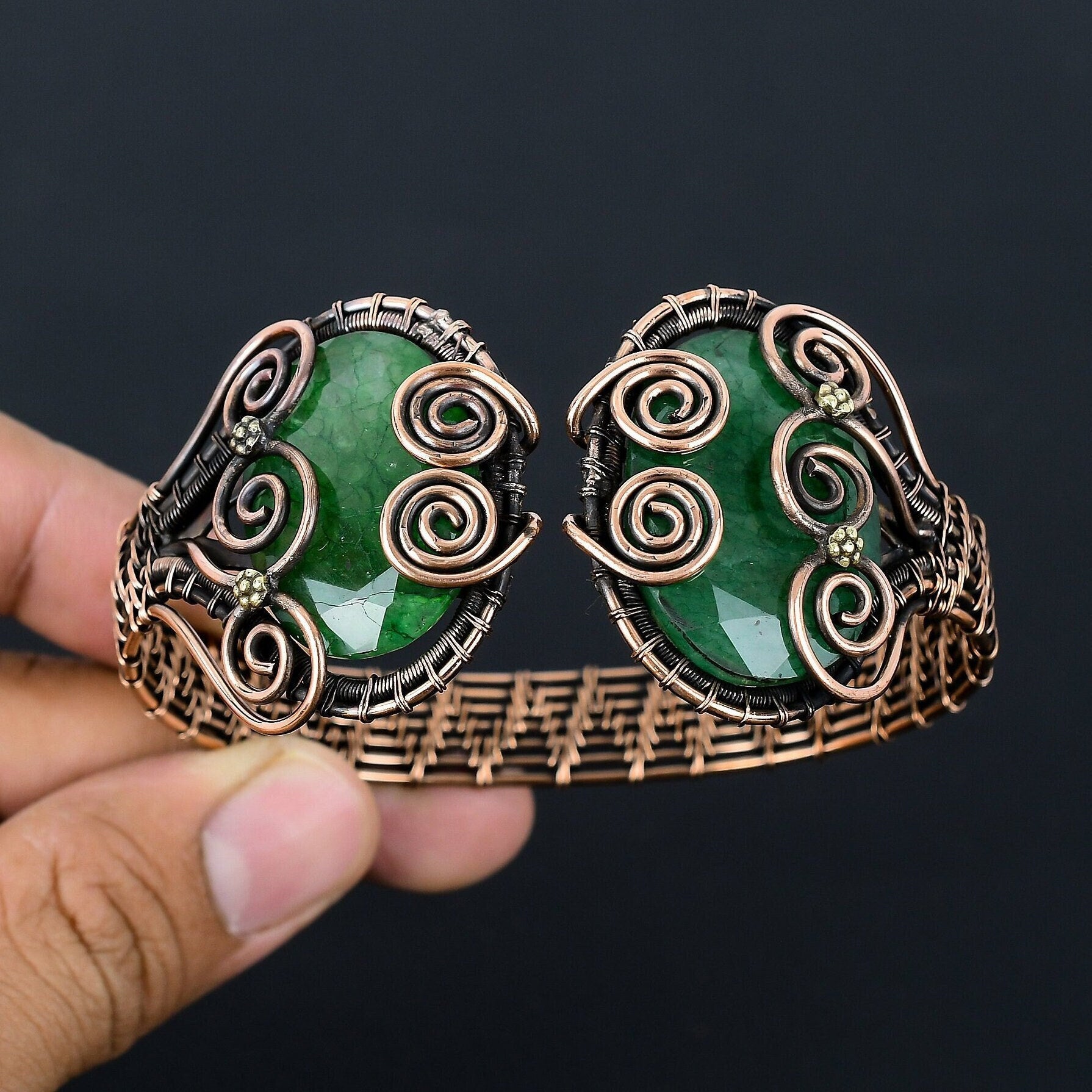 This unique piece features mesmerizing green stones intricately entwined with swirling copper wire designs.