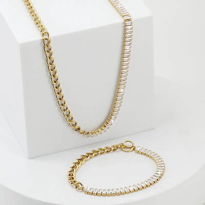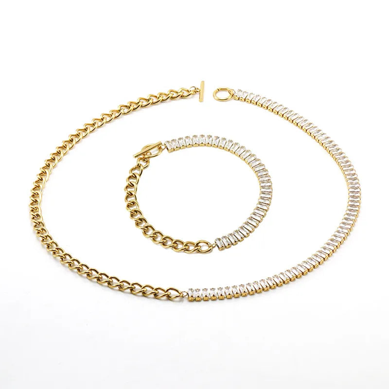 This luxurious ensemble features a stunning necklace and matching bracelet, each crafted with high-quality gold and adorned with dazzling diamonds.