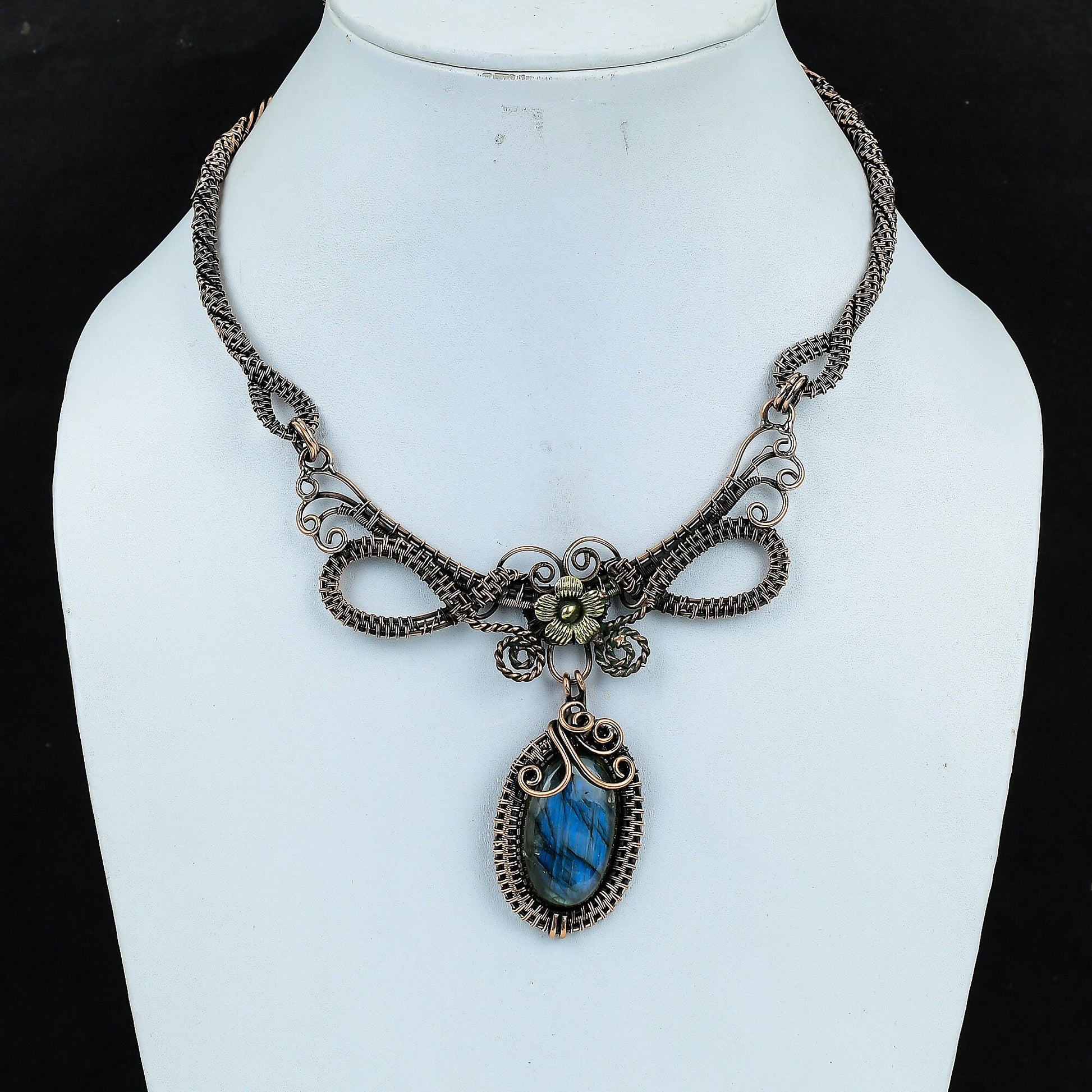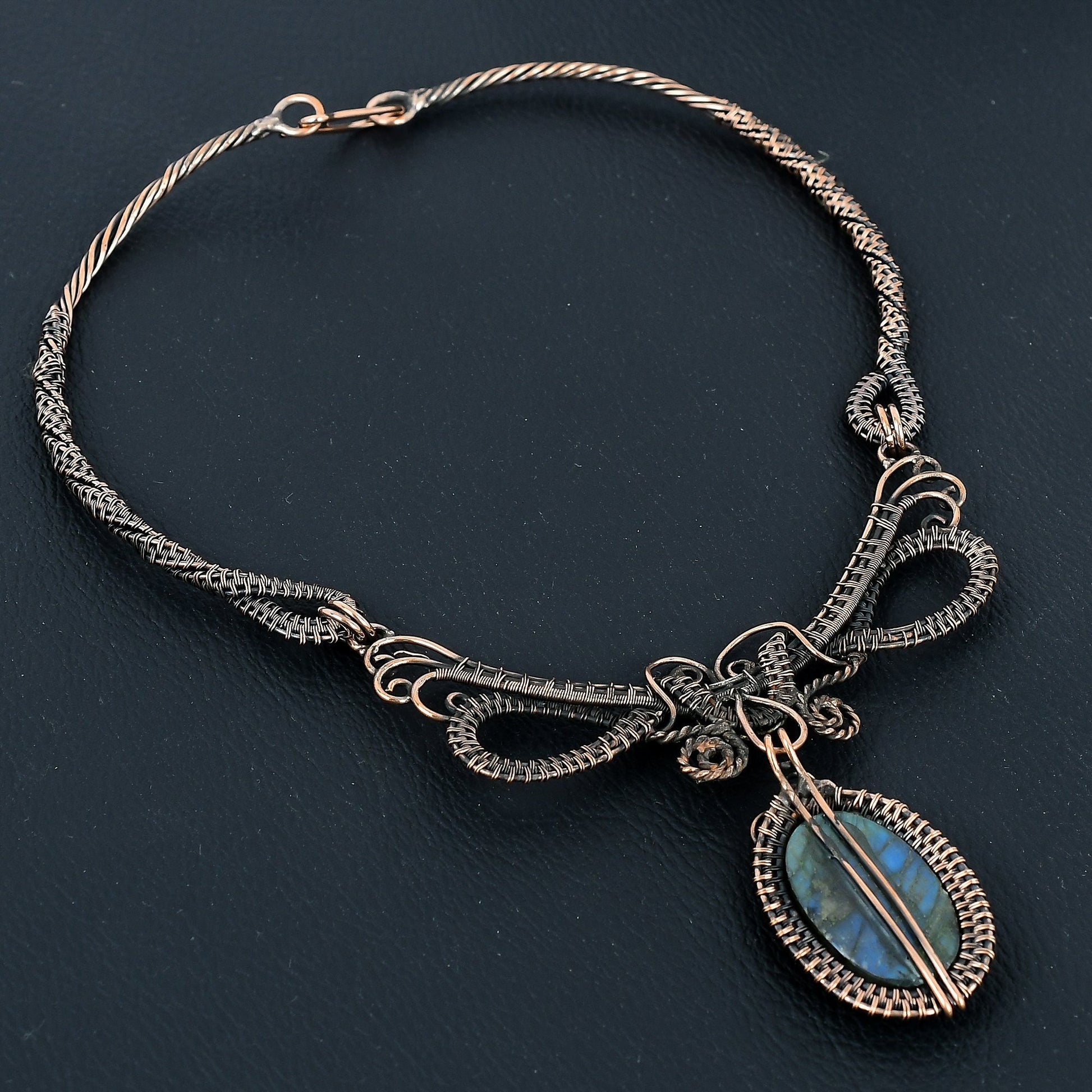Experience the exquisite elegance of our handcrafted wire-wrapped necklace, a true masterpiece that captivates with its intricate design and stunning centerpiece.