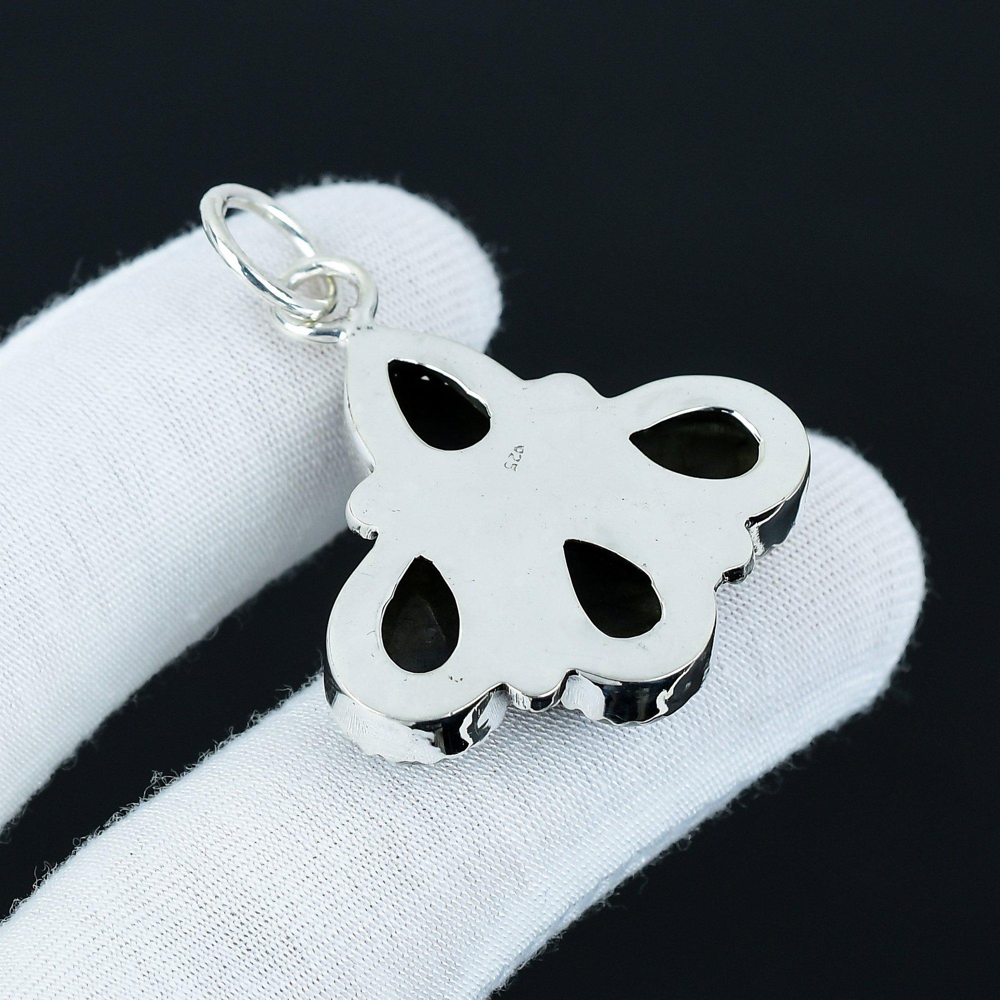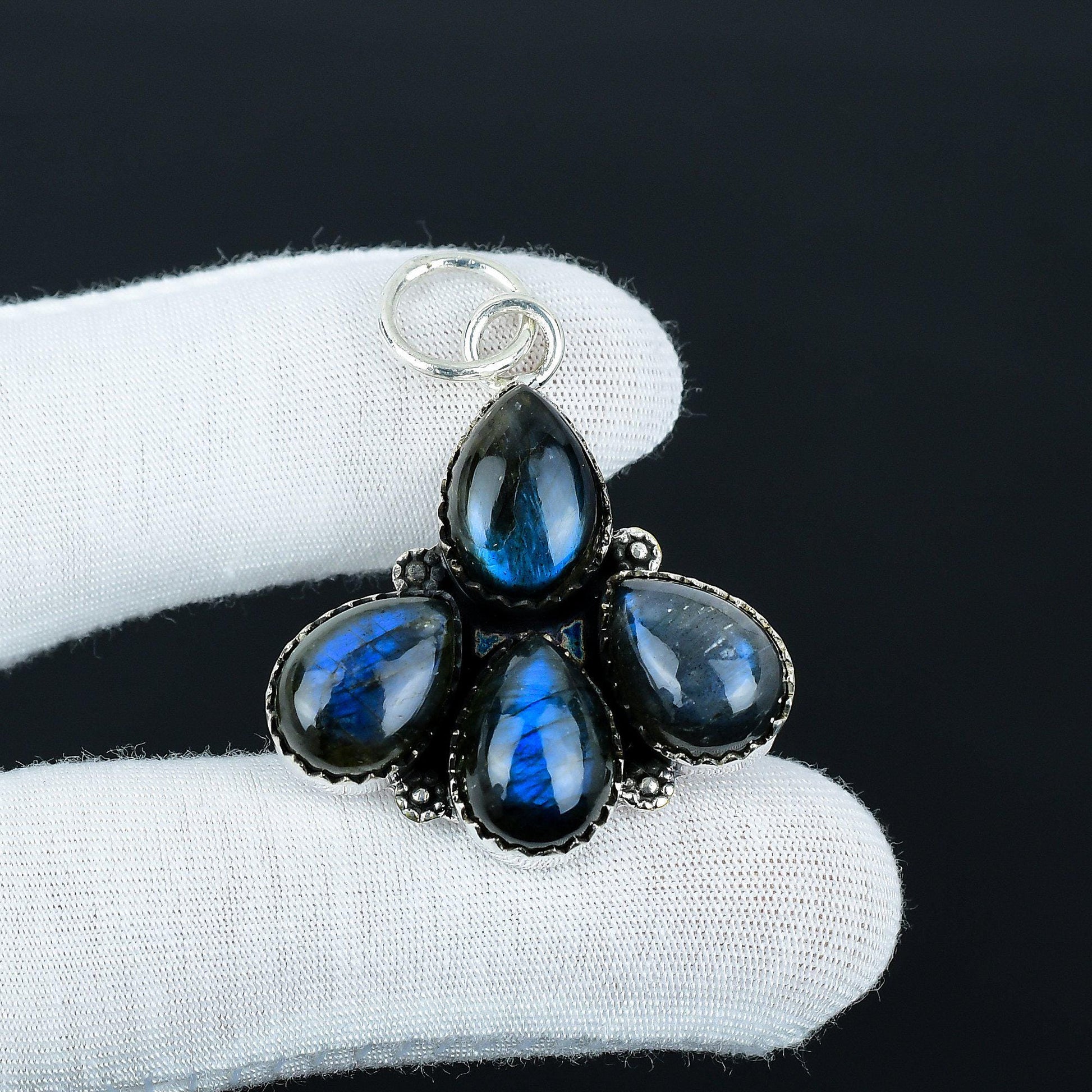 - Features four teardrop-shaped labradorite stones, known for their captivating iridescent sheen.
