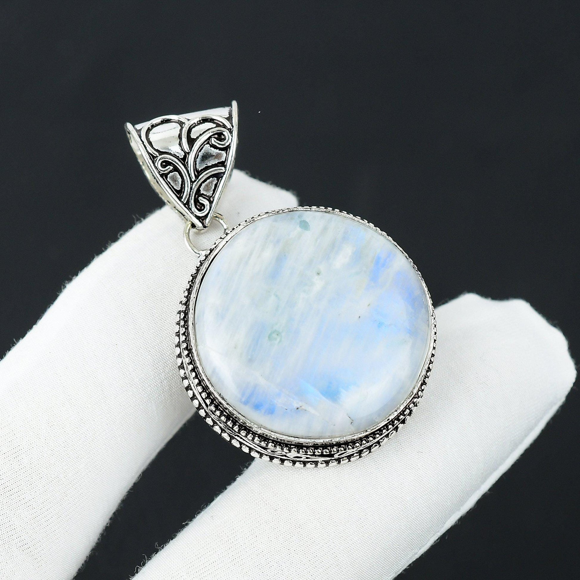 The pendant features a captivating round moonstone, known for its subtle blue sheen and mystical allure. It's set in a classic sterling silver frame adorned with intricate vintage-inspired patterns, adding a touch of sophistication and charm.