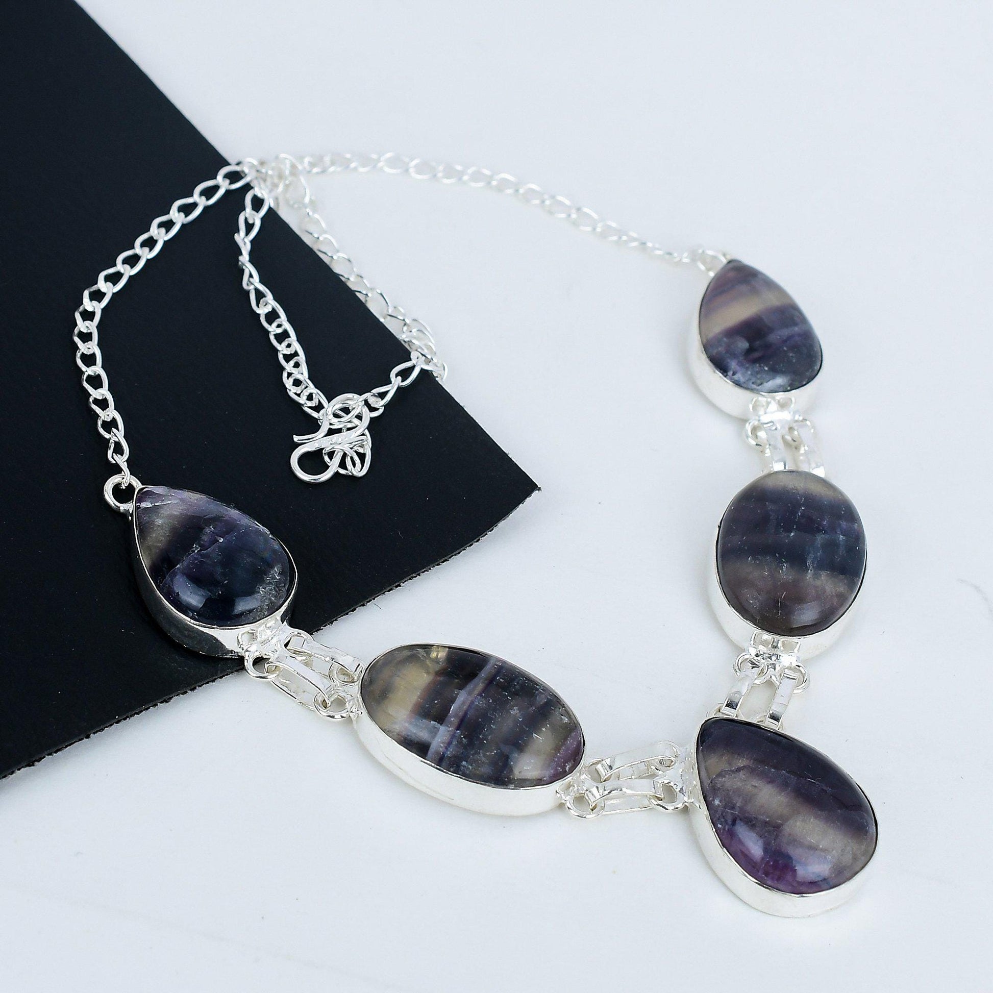 Elevate your style with this exquisite silver necklace, featuring a captivating series of polished purple stones.
