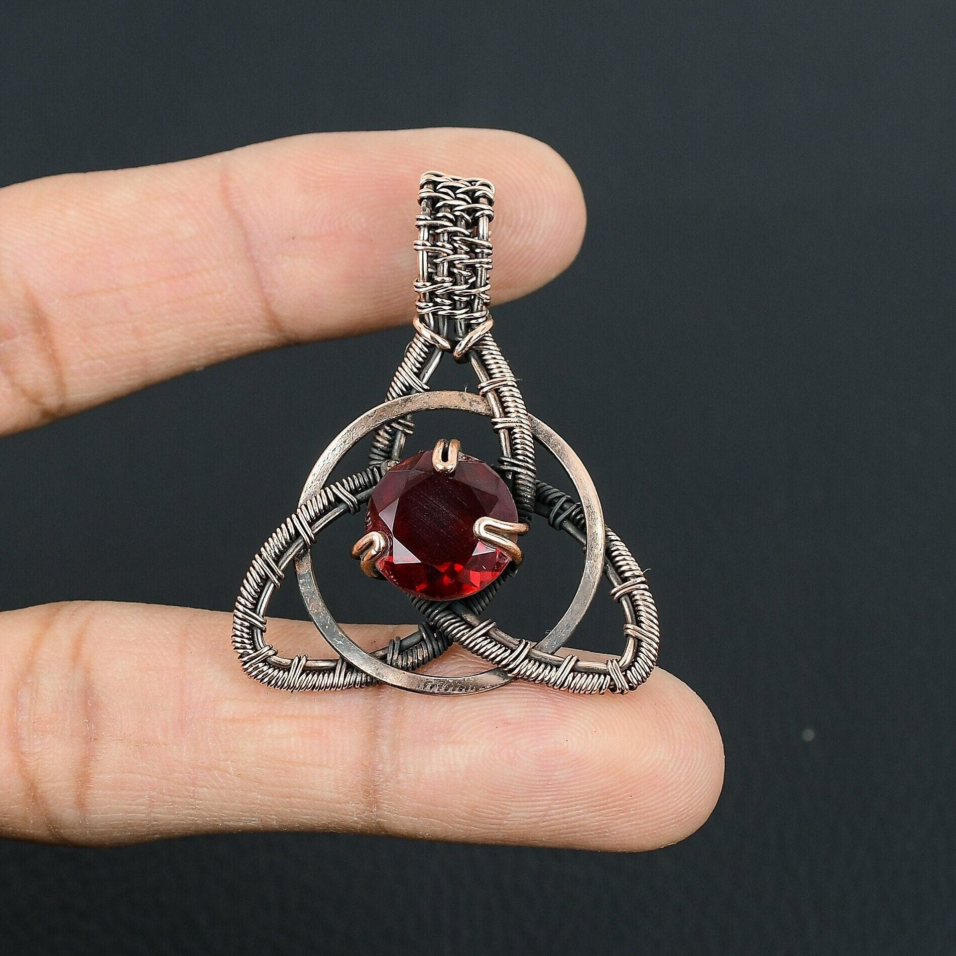Featuring a vivid red gemstone, this pendant captures both light and admiration. The intricate wirework, forming an intricate trinity knot design, symbolizes eternal strength and unity. Skillfully wrapped in premium metal, each piece is a testament to artisanal craftsmanship.