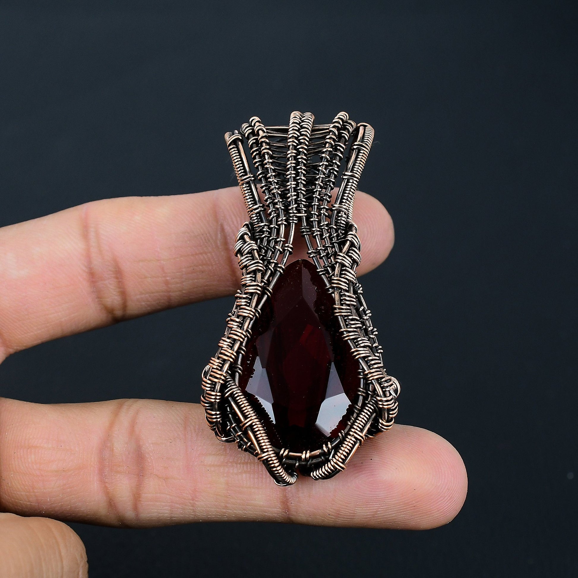 Design: Meticulously crafted with intricate wire weaving, this unique accessory features a deep crimson gemstone, adding a touch of luxury to any outfit.