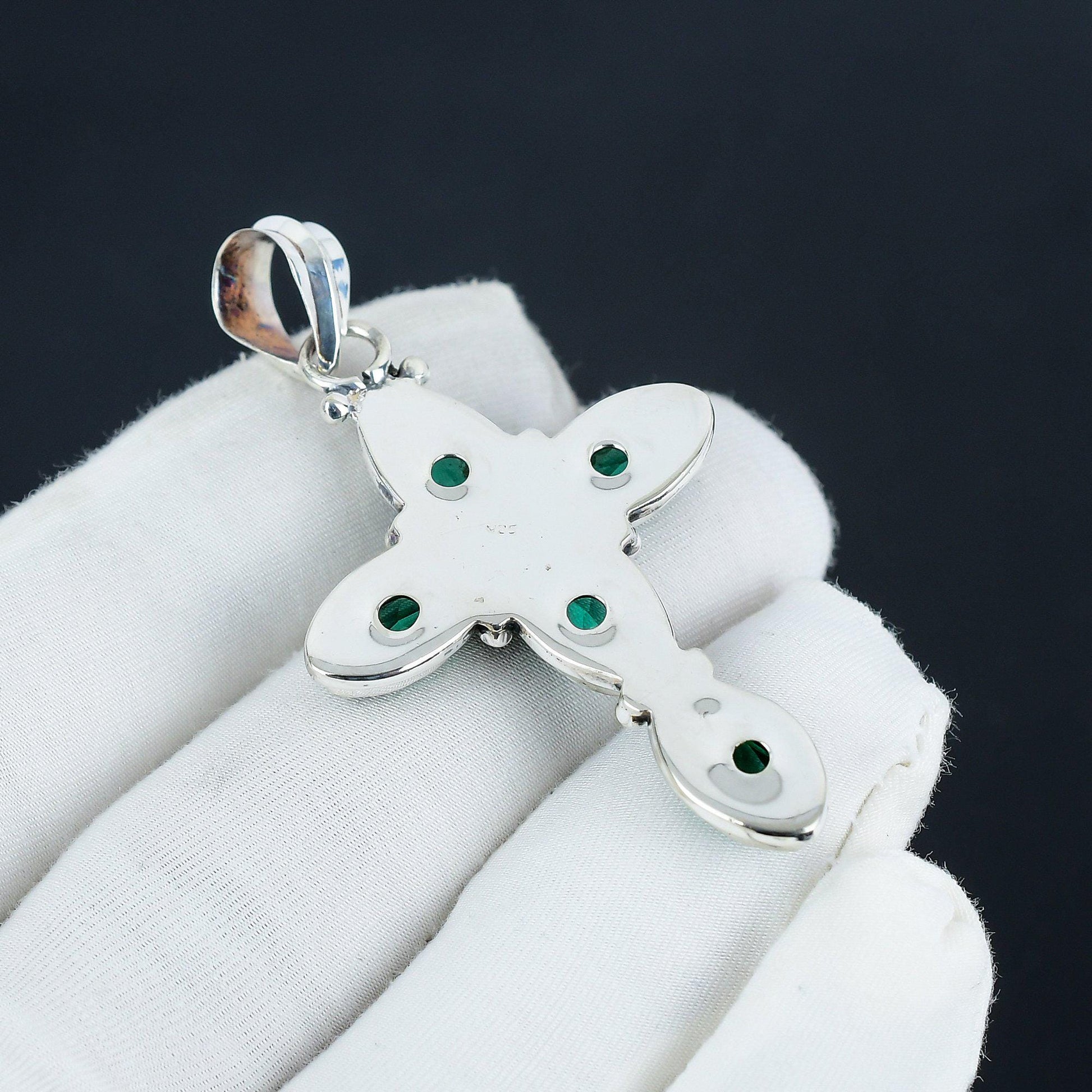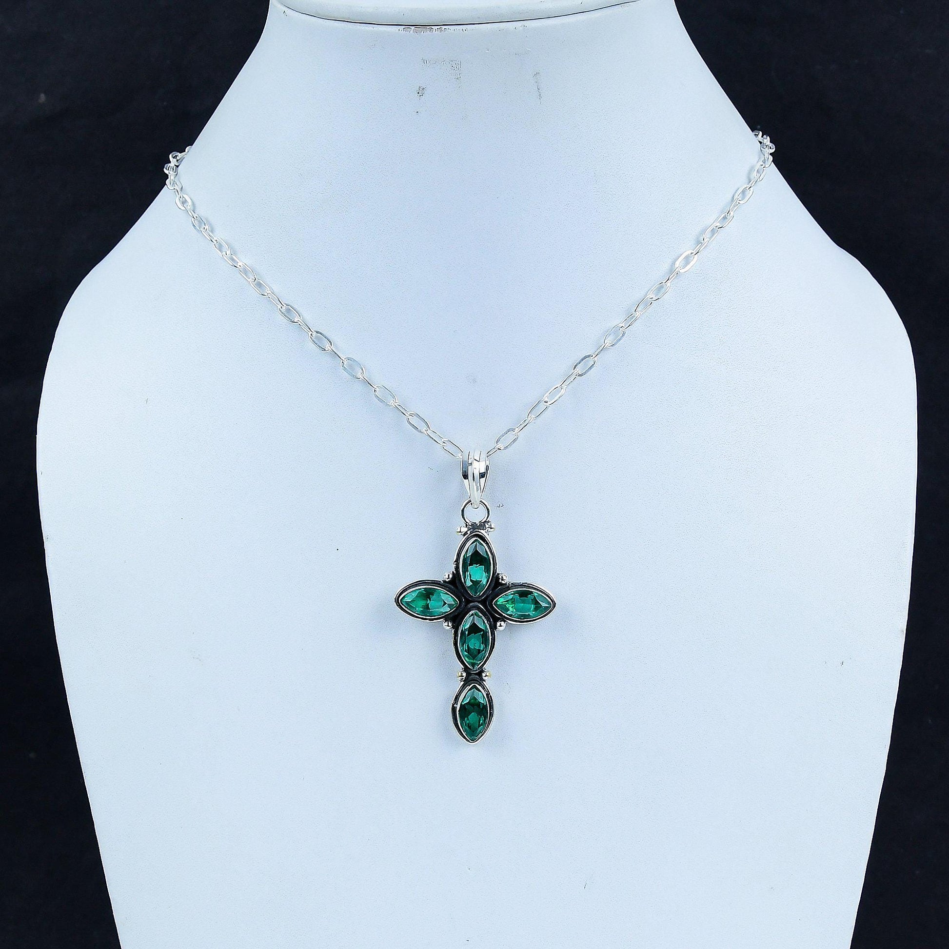 Design: This captivating pendant features a cross motif made from four stunning marquise-cut green gemstones, artfully set in an intricate silver setting.