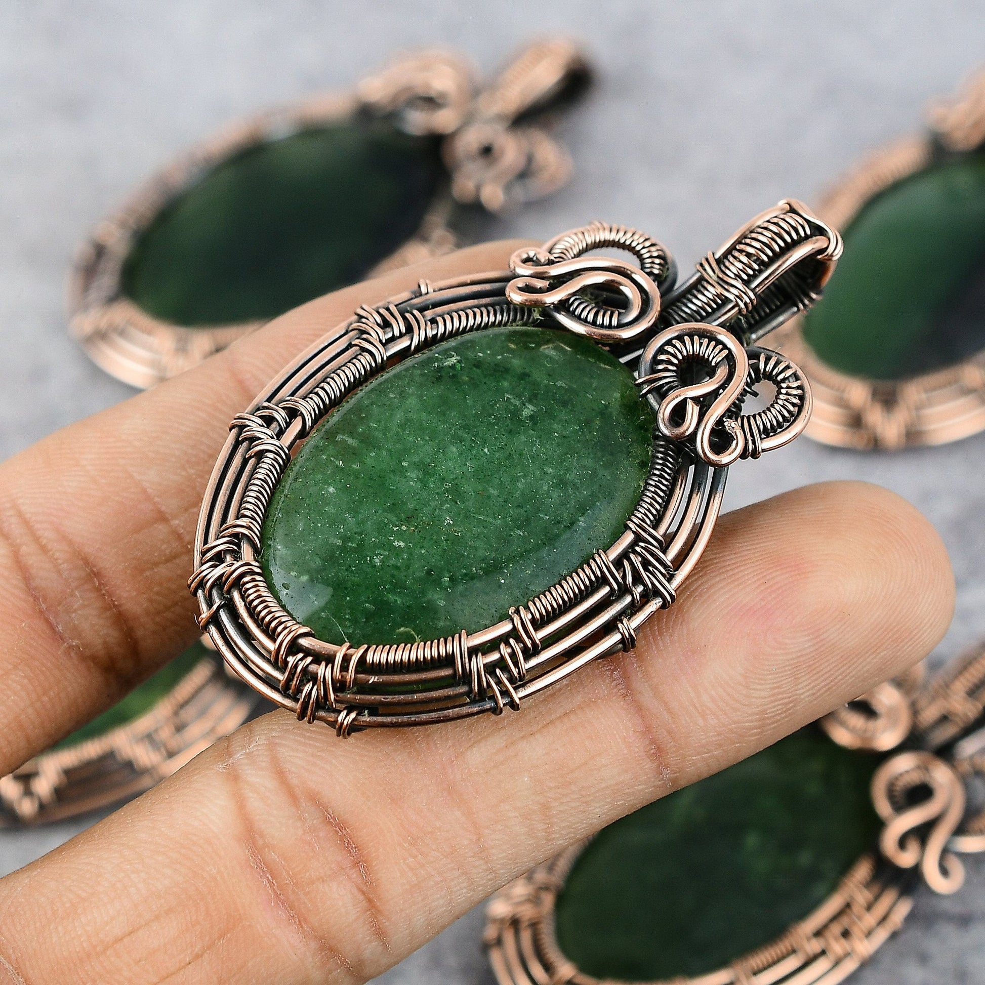 The centerpiece features a stunning green stone, beautifully surrounded by intricate copper wirework, creating a perfect blend of earthy warmth and timeless style.
