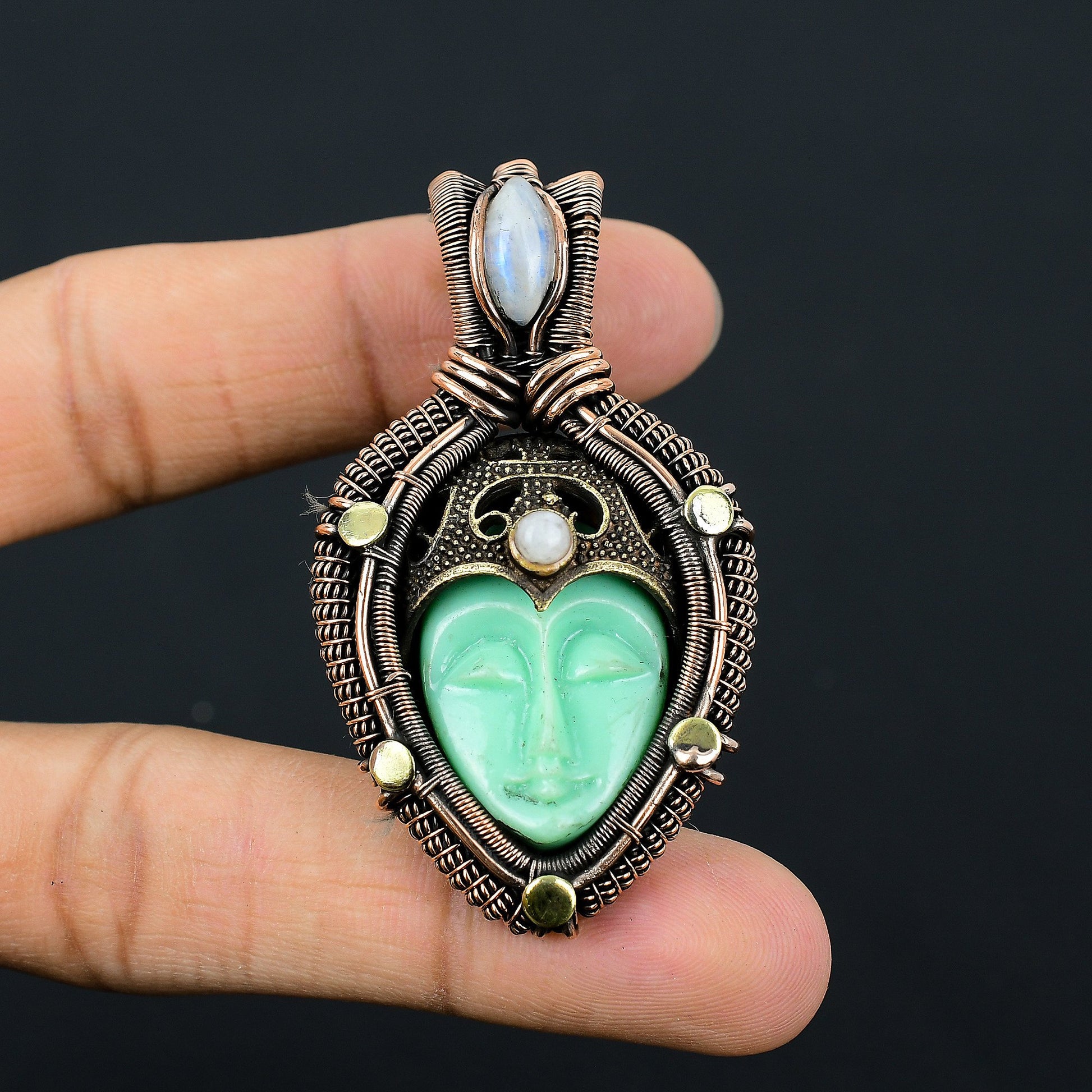 The pendant showcases an elegant contrast between the earthy tones of copper wire and the calming green of the carved face, creating a harmonious balance that speaks to the soul.