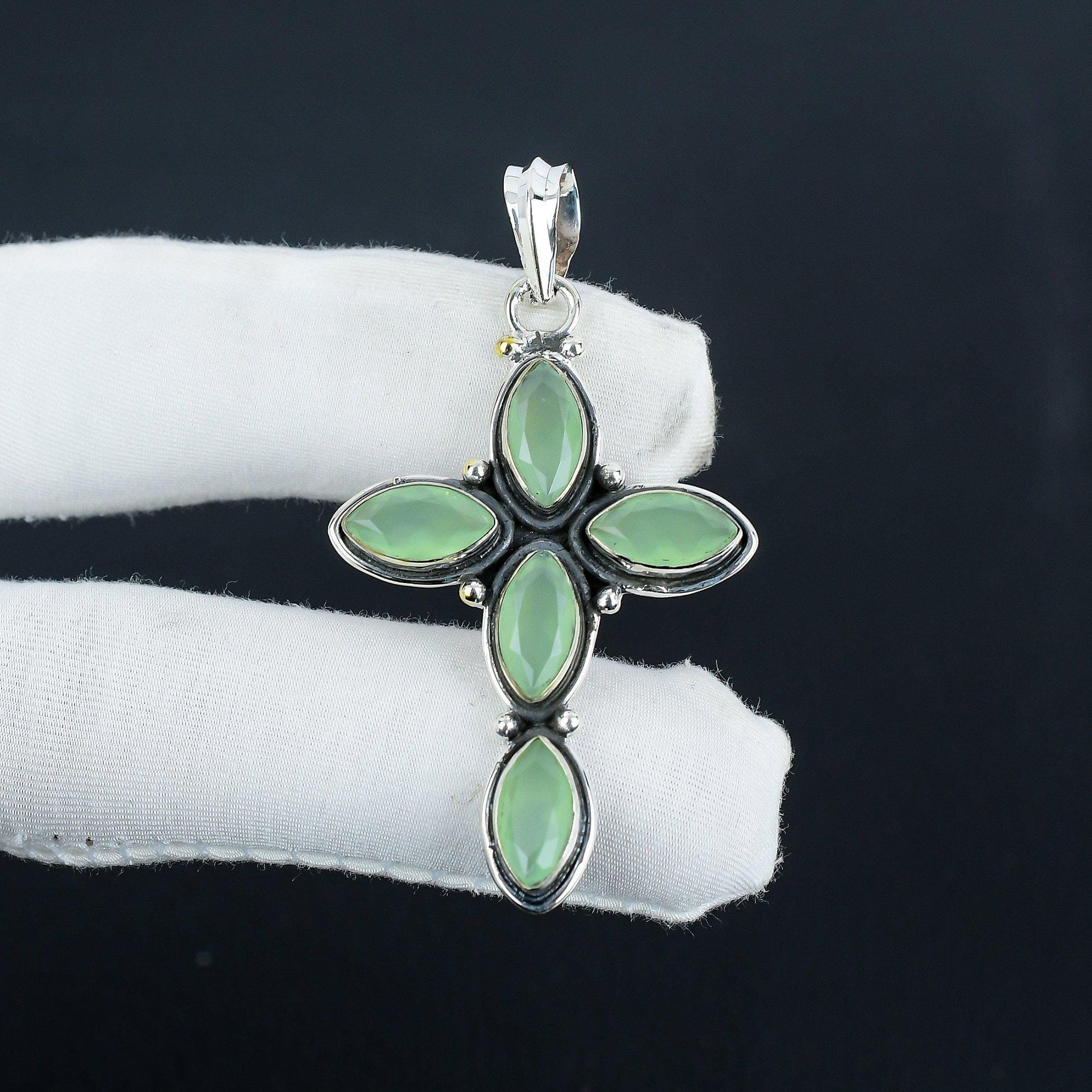 Embrace elegance with this exquisite cross-shaped pendant, featuring four stunning marquise-cut green gemstones.