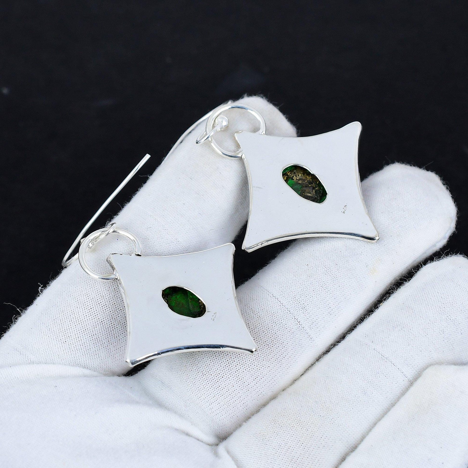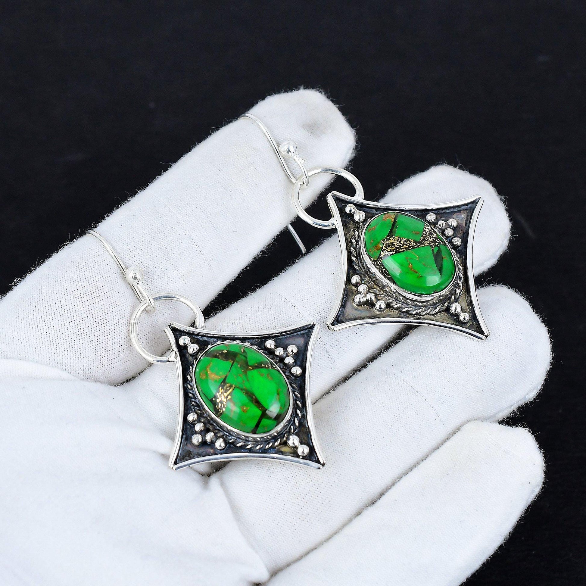 Each earring beautifully showcases a vibrant green gemstone, meticulously set in a striking silver-tone metal frame.