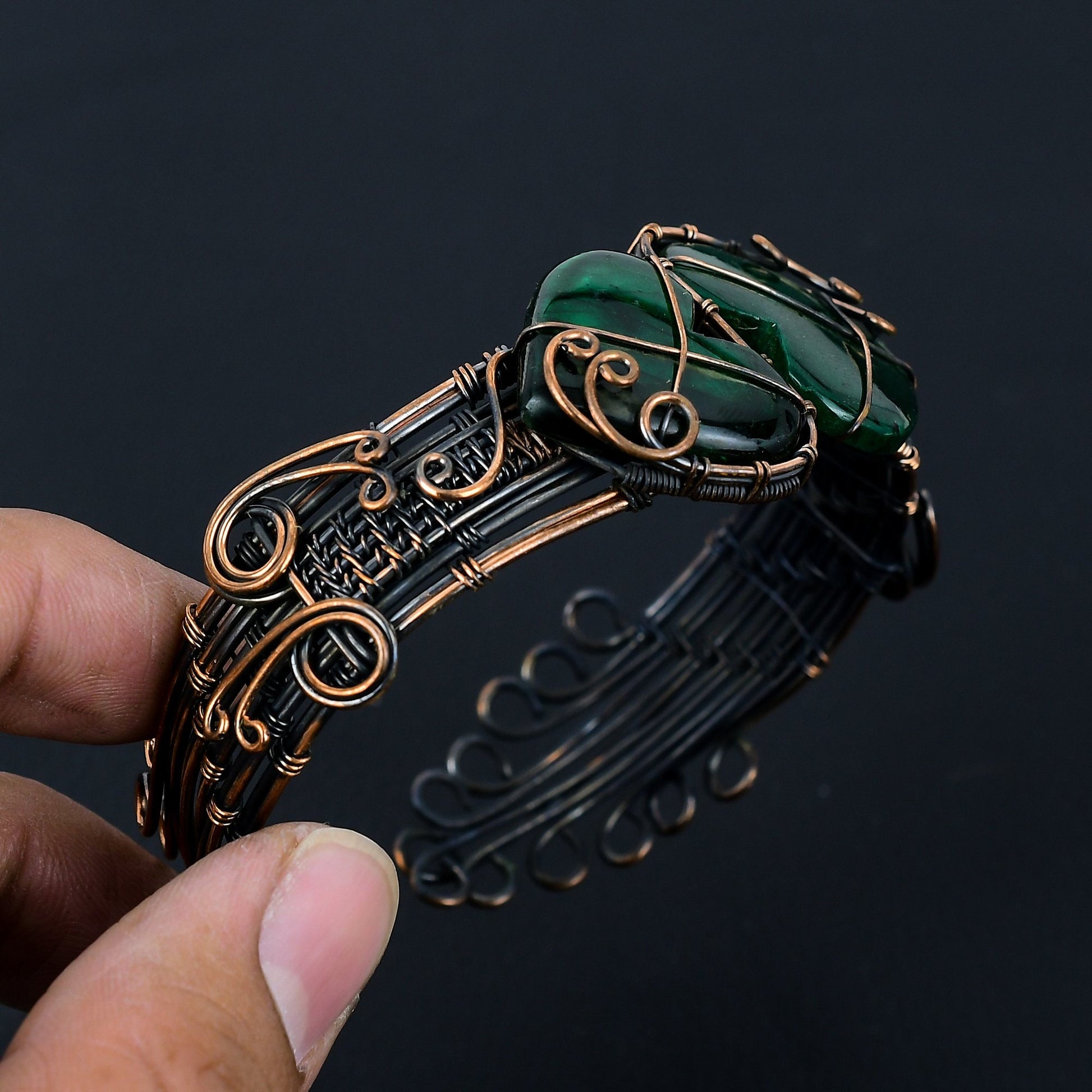 Featuring intricately wrapped emerald green stones, this piece is accentuated by artistic wirework.