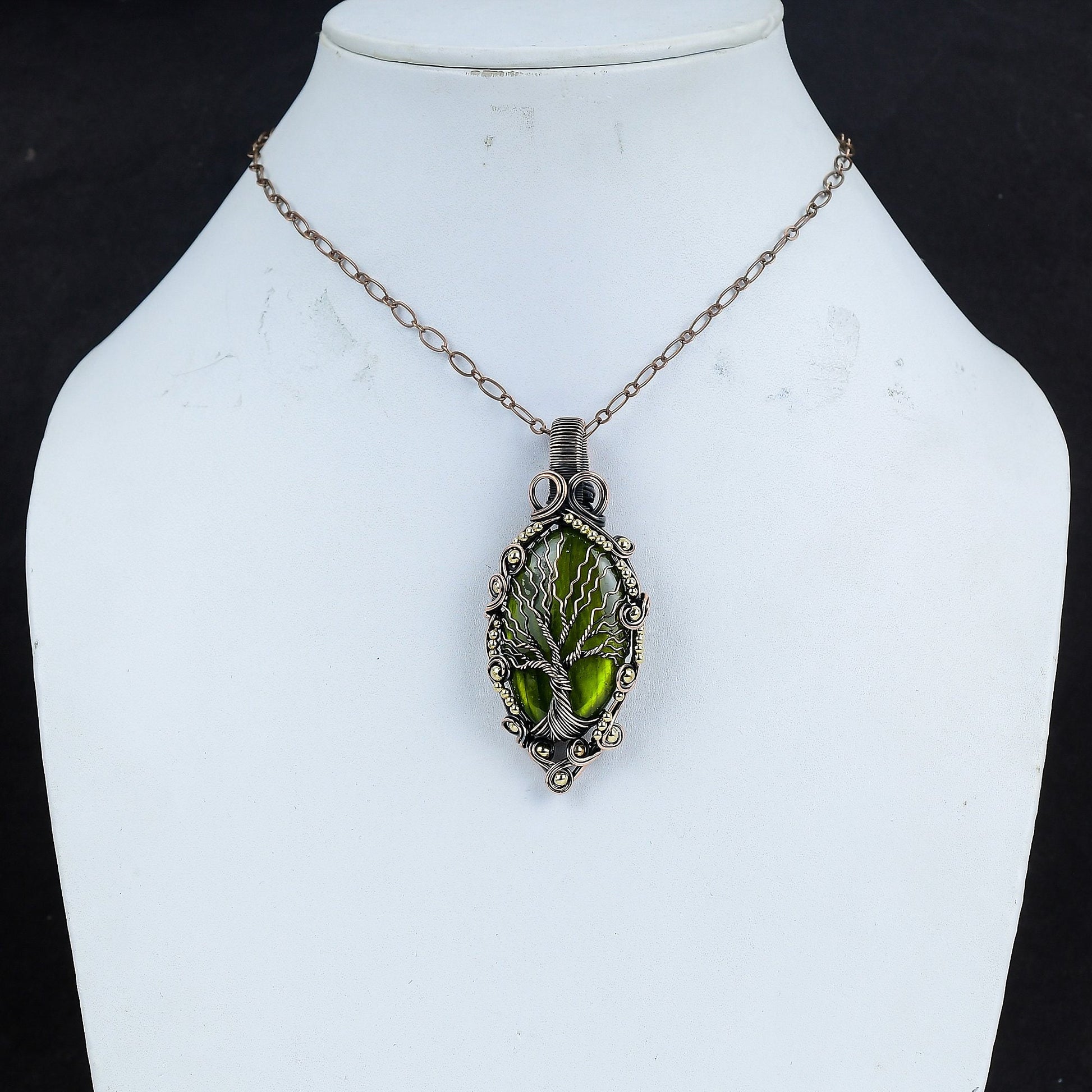 Meticulously handcrafted, this pendant features a captivating green gemstone encased in intricate metalwork, symbolizing growth and balance.