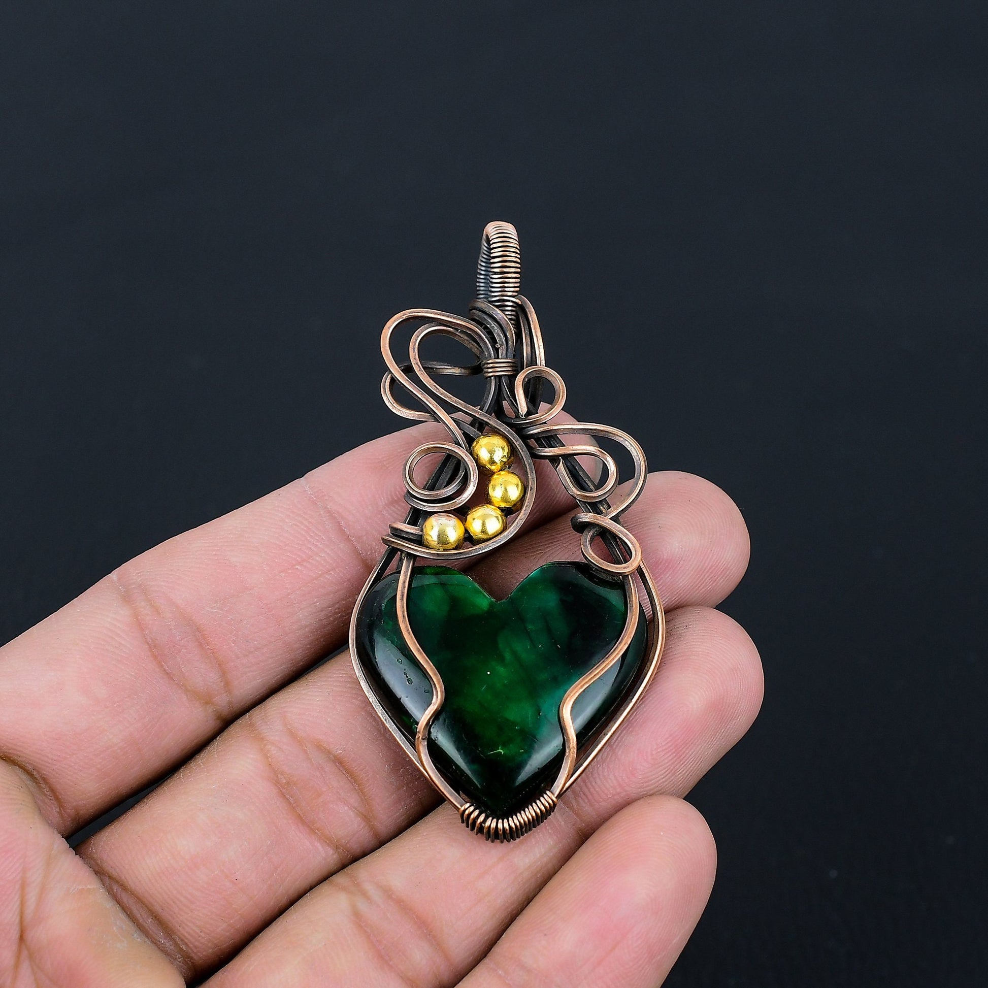 Design: A stunning heart-shaped green stone is the centerpiece, beautifully wrapped with intricate copper wirework.