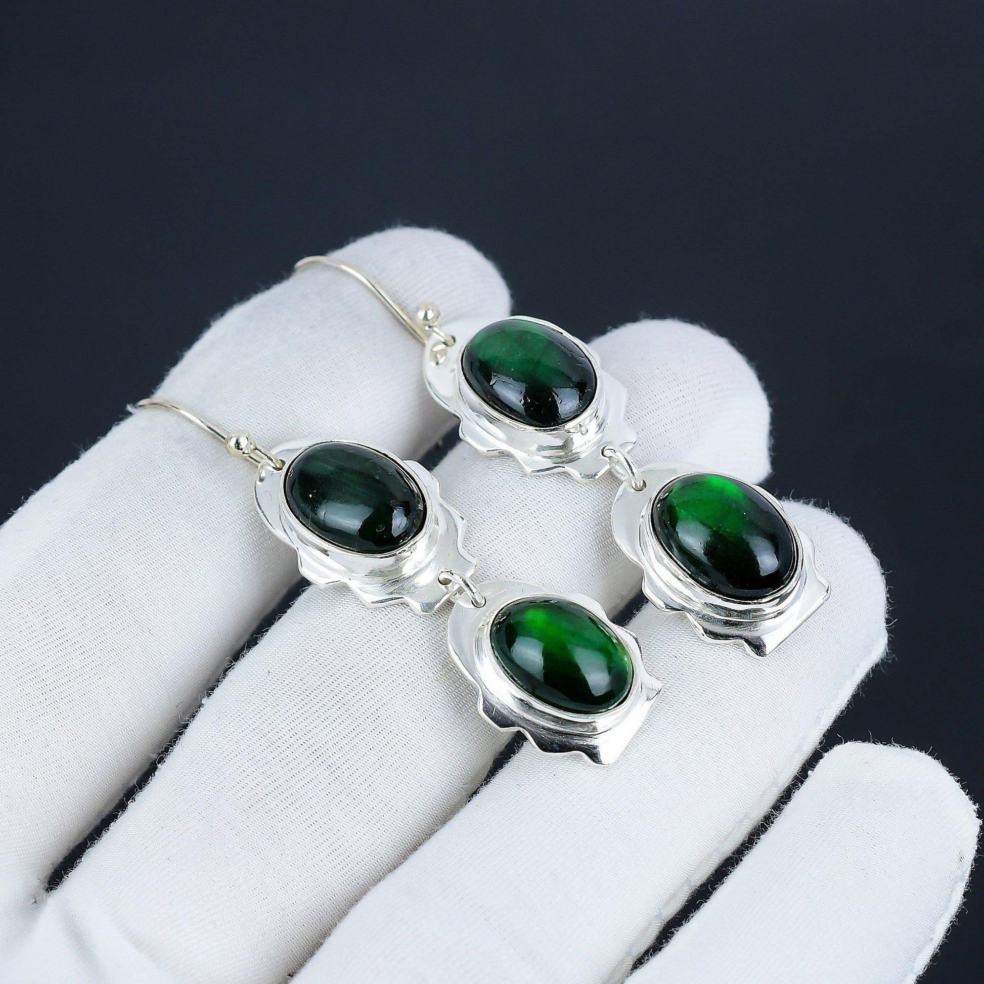 Design: Each earring features a stunning oval emerald green gemstone, set in a sleek and polished silver frame.