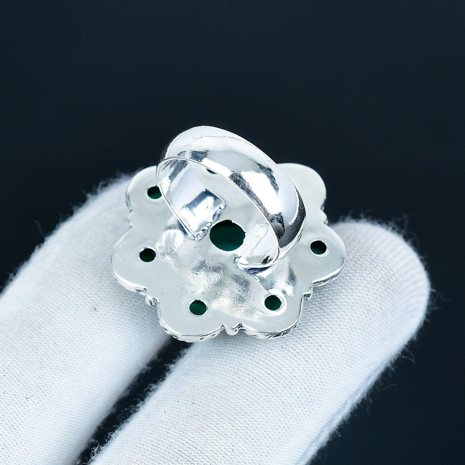 Design: This stunning ring features a captivating cluster design, adorned with seven vibrant green agate stones, each set intricately within ornate silver detailing.