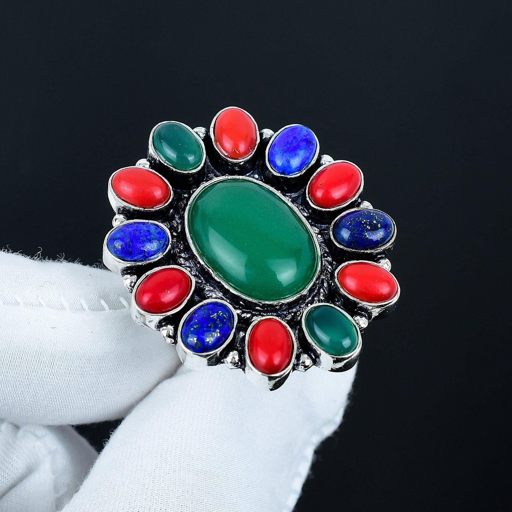 This unique piece boasts a stunning central green gemstone, beautifully framed by a harmonious combination of vibrant red and deep blue stones.