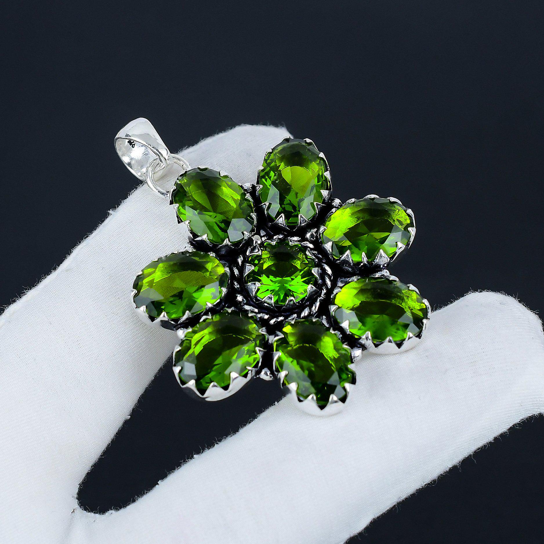 Featuring a stunning array of vibrant green stones meticulously arranged in a floral pattern, this pendant brings a touch of nature-inspired beauty to any ensemble.