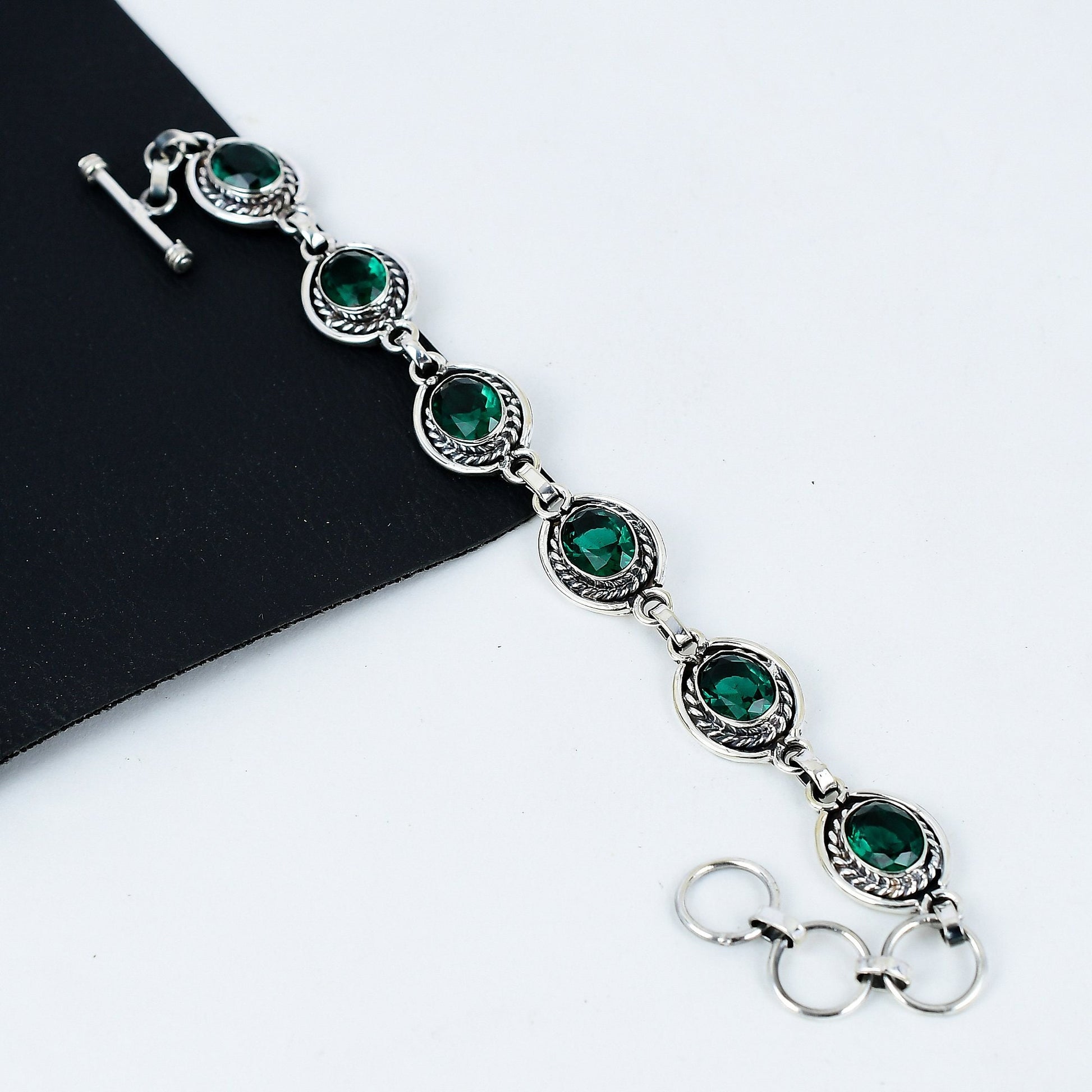 Featuring a series of radiant green gemstones, each delicately encased in a detailed setting, this bracelet adds a touch of sophistication to any outfit.