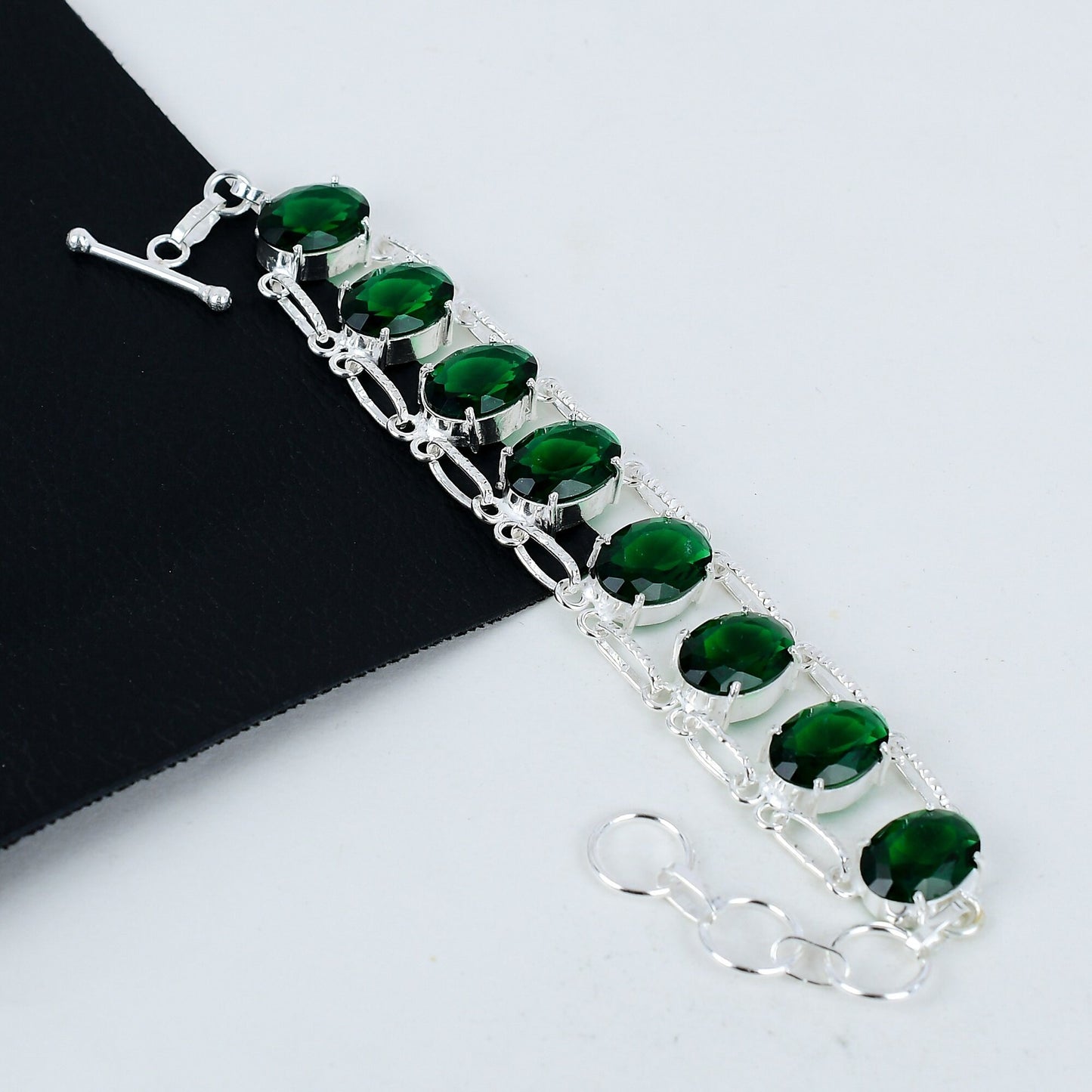 Elevate your elegance with this exquisite bracelet, adorned with enchanting emerald-hued stones that capture the magic of a forest at sunset.