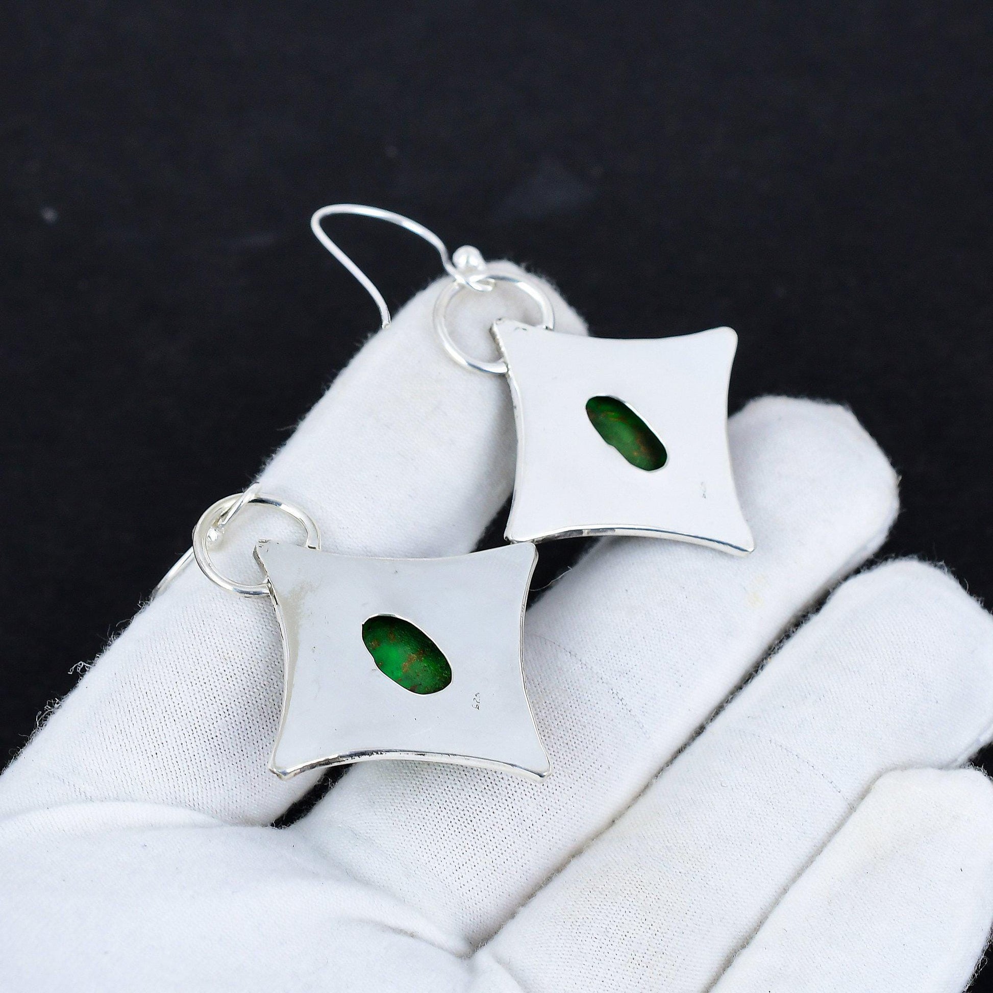 Elevate your style with these exquisite handcrafted earrings, featuring vibrant green stones set in an intricately designed silver-tone frame.