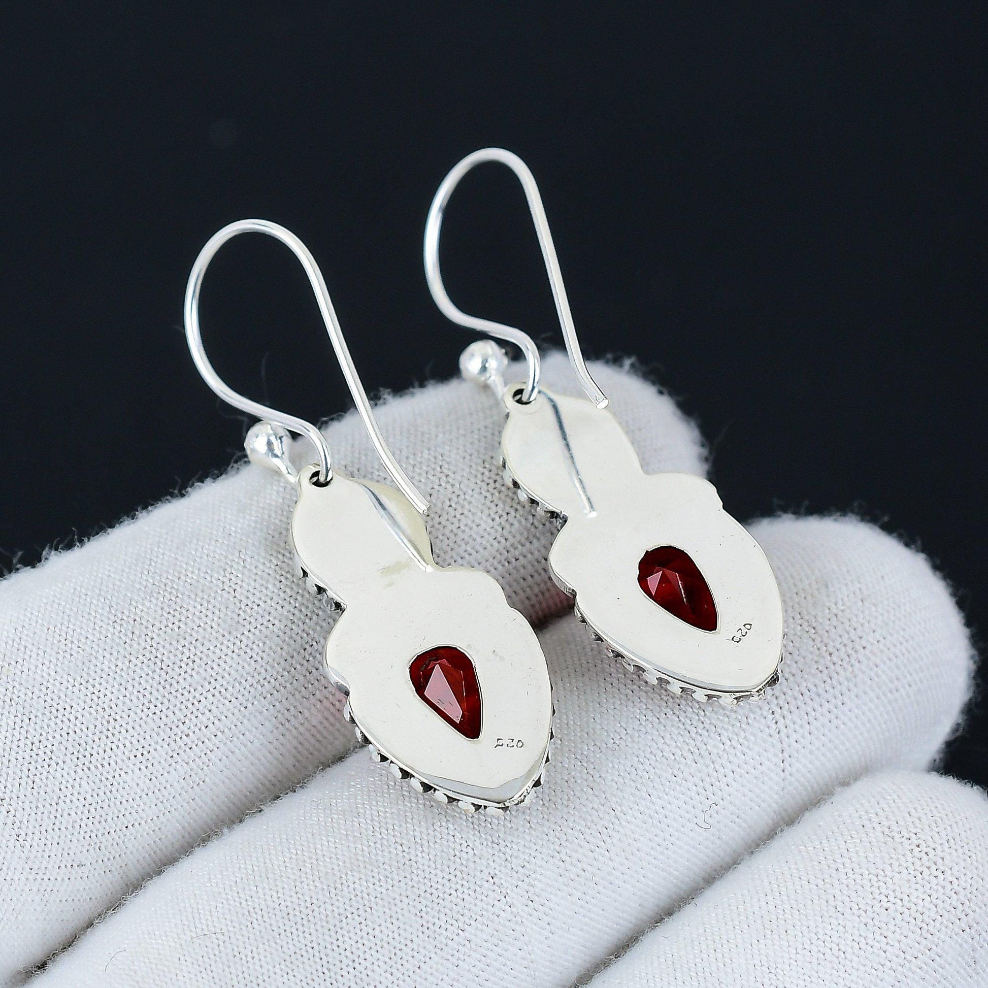 Elevate your elegance with these exquisite drop earrings, featuring dazzling red gemstones set in a beautifully detailed silver-tone design.