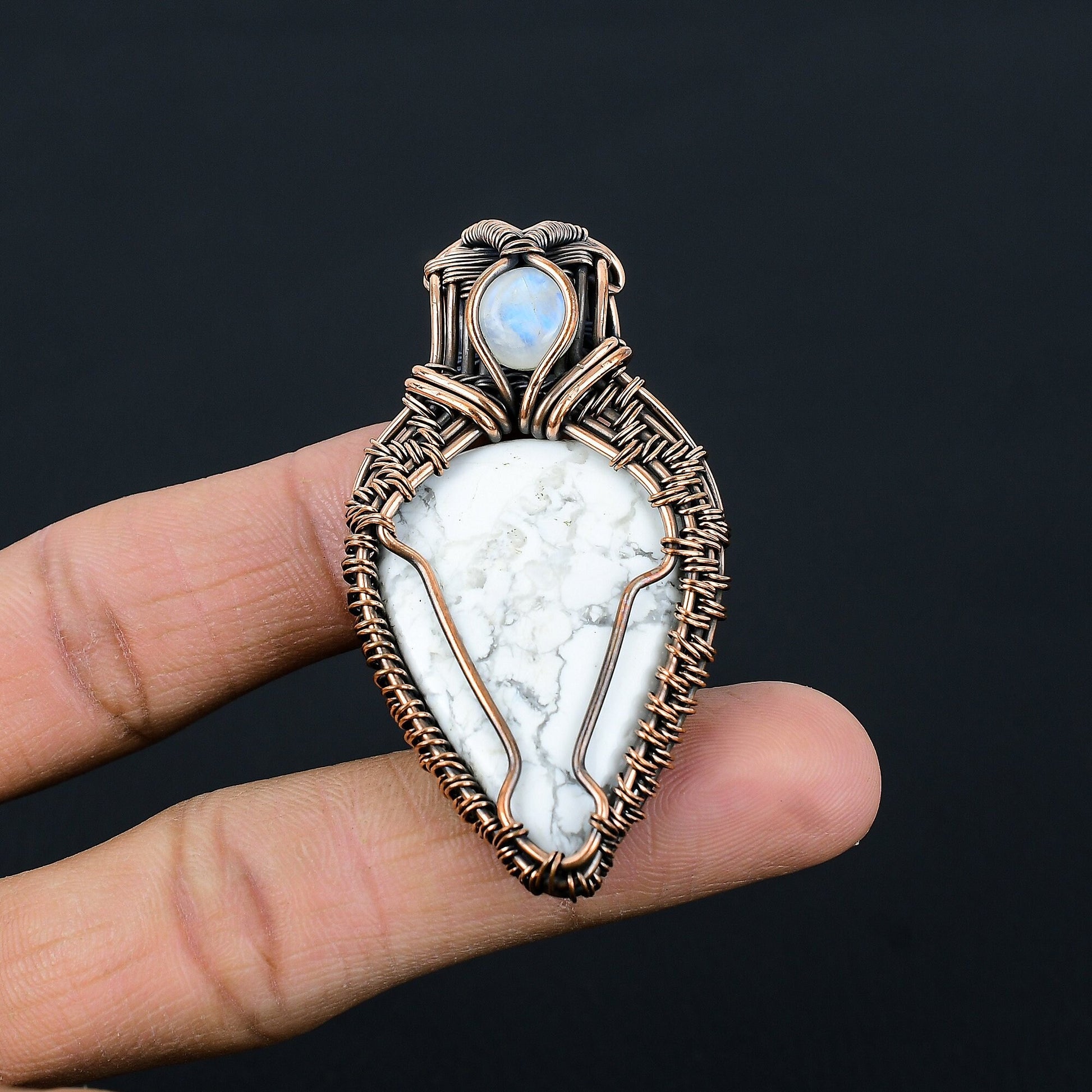 Discover elegance and craftsmanship with our meticulously handcrafted pendant. This exquisite piece showcases a stunning white stone, expertly woven with copper wire in intricate patterns that catch the eye.