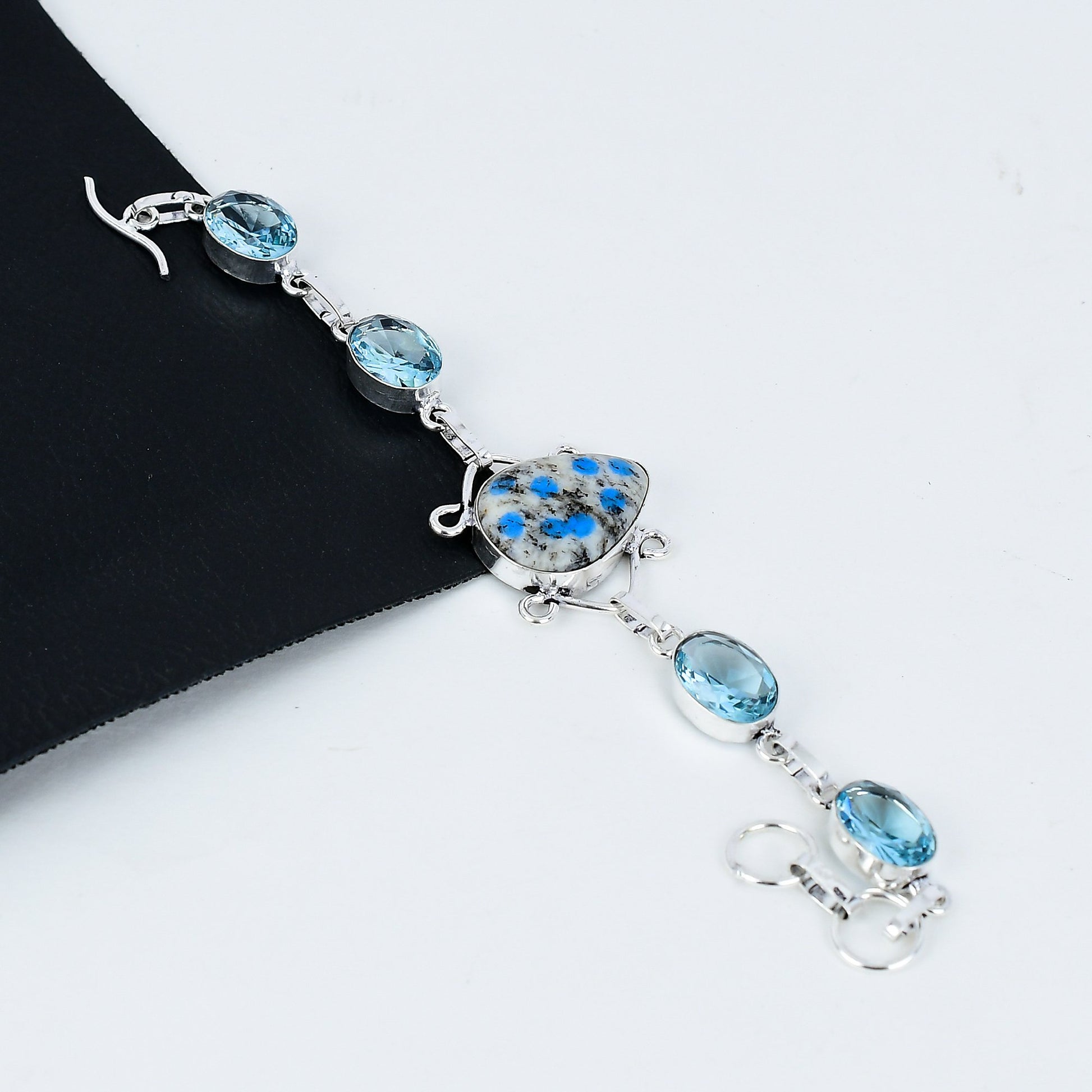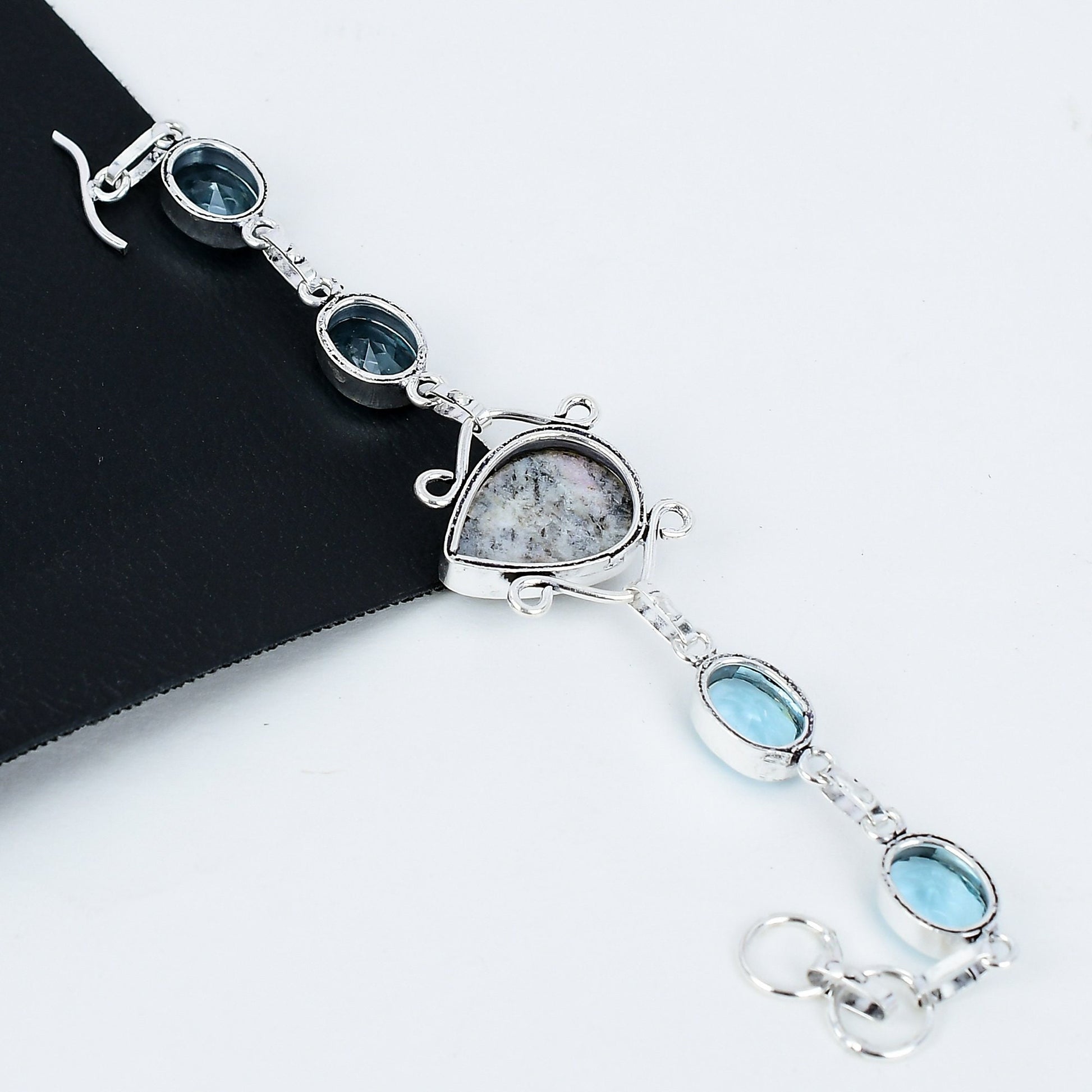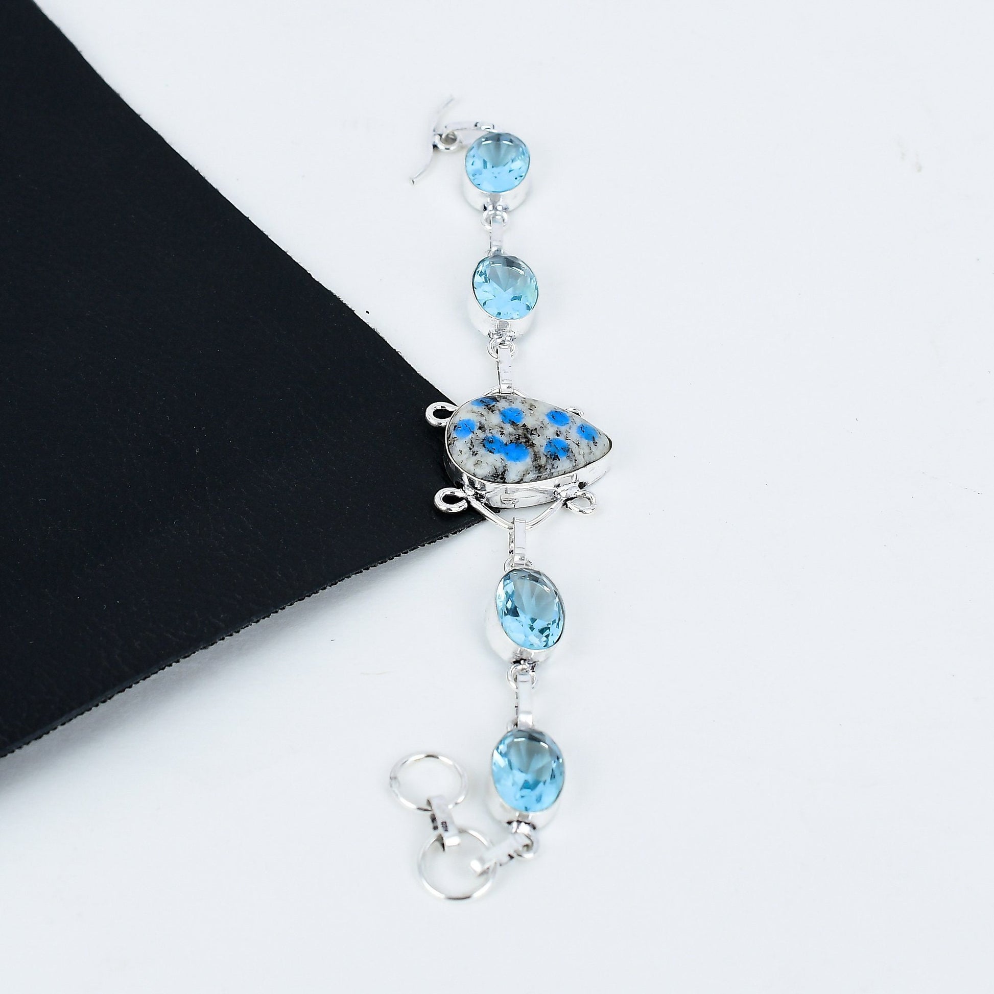 Indulge in elegance with this exquisite bracelet, featuring a stunning combination of vibrant blue gemstones and an intricately patterned stone centerpiece.