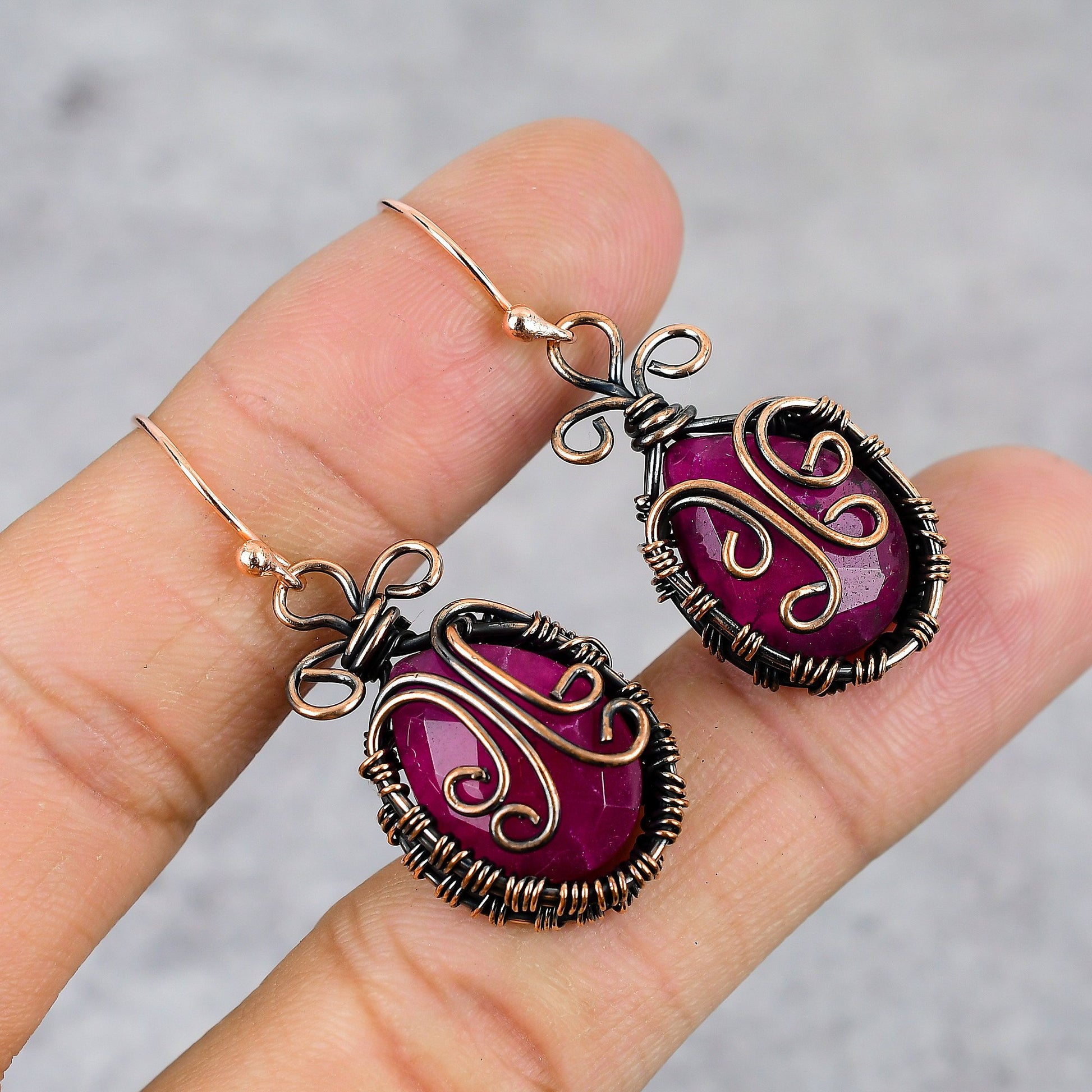 Elevate your style with these exquisite handmade earrings, featuring captivating deep pink stones set in intricate copper wirework.
