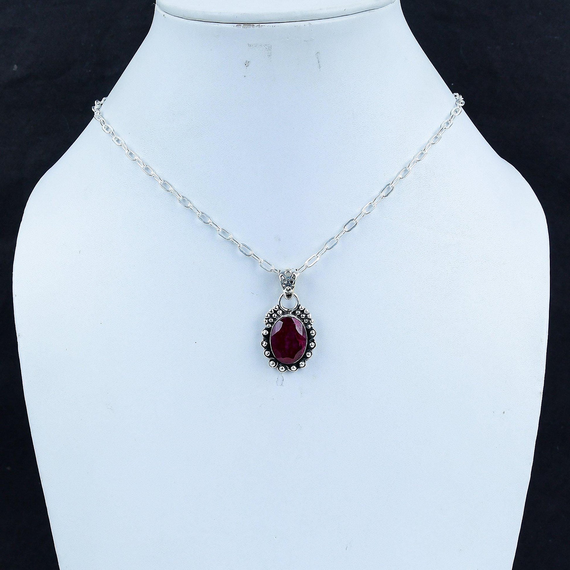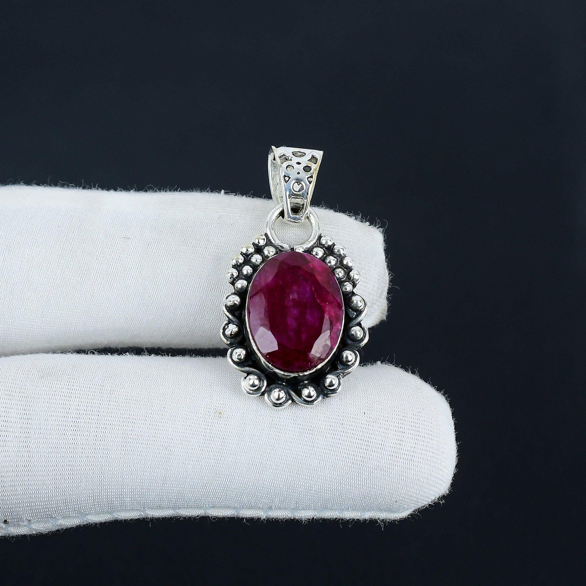 Design: The pendant features a vivid oval-cut ruby, set amidst intricate silver detailing that adds a touch of vintage allure.