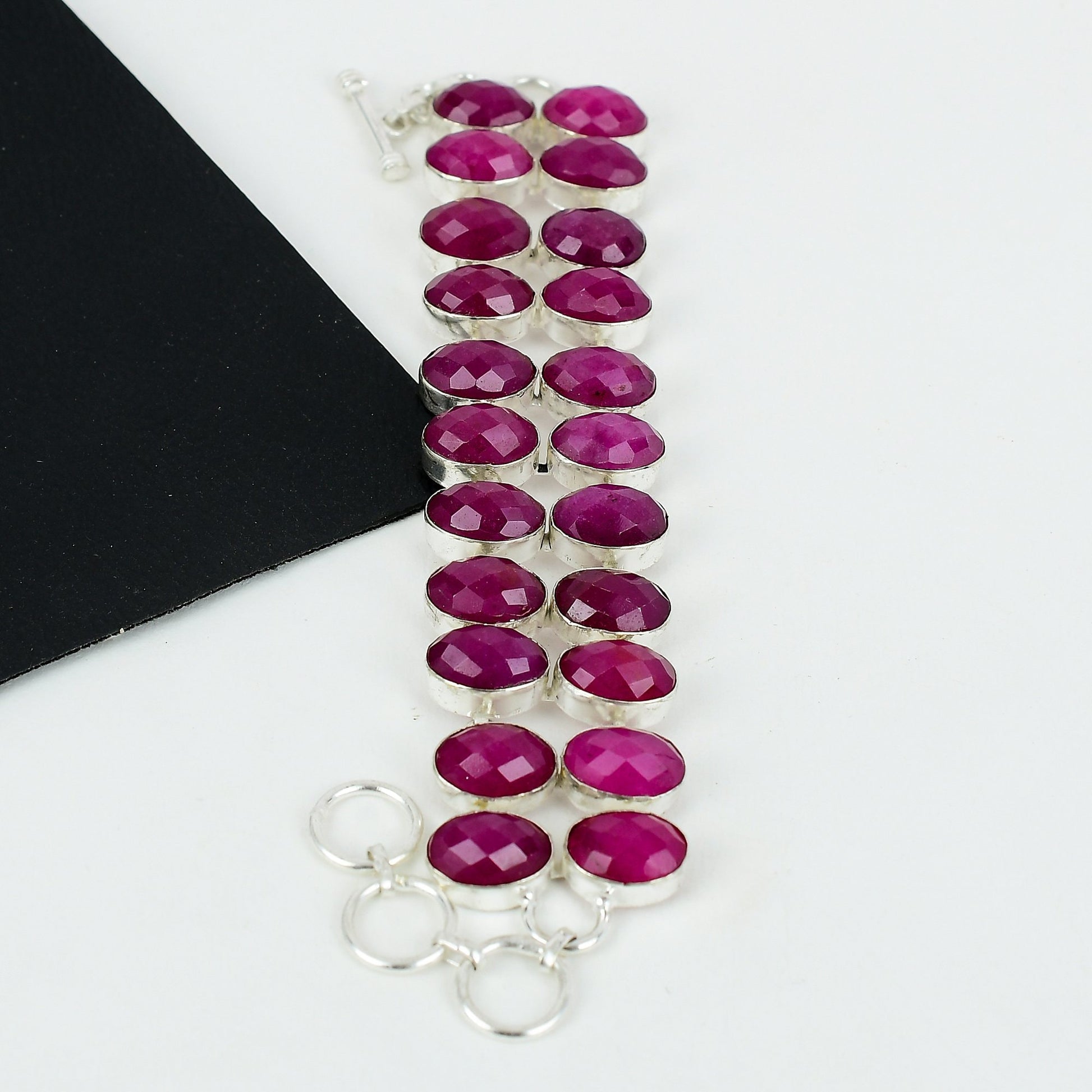 This stunning bracelet features an array of vibrant, faceted ruby gemstones, each set in high-quality sterling silver, ensuring both durability and a luxurious finish.