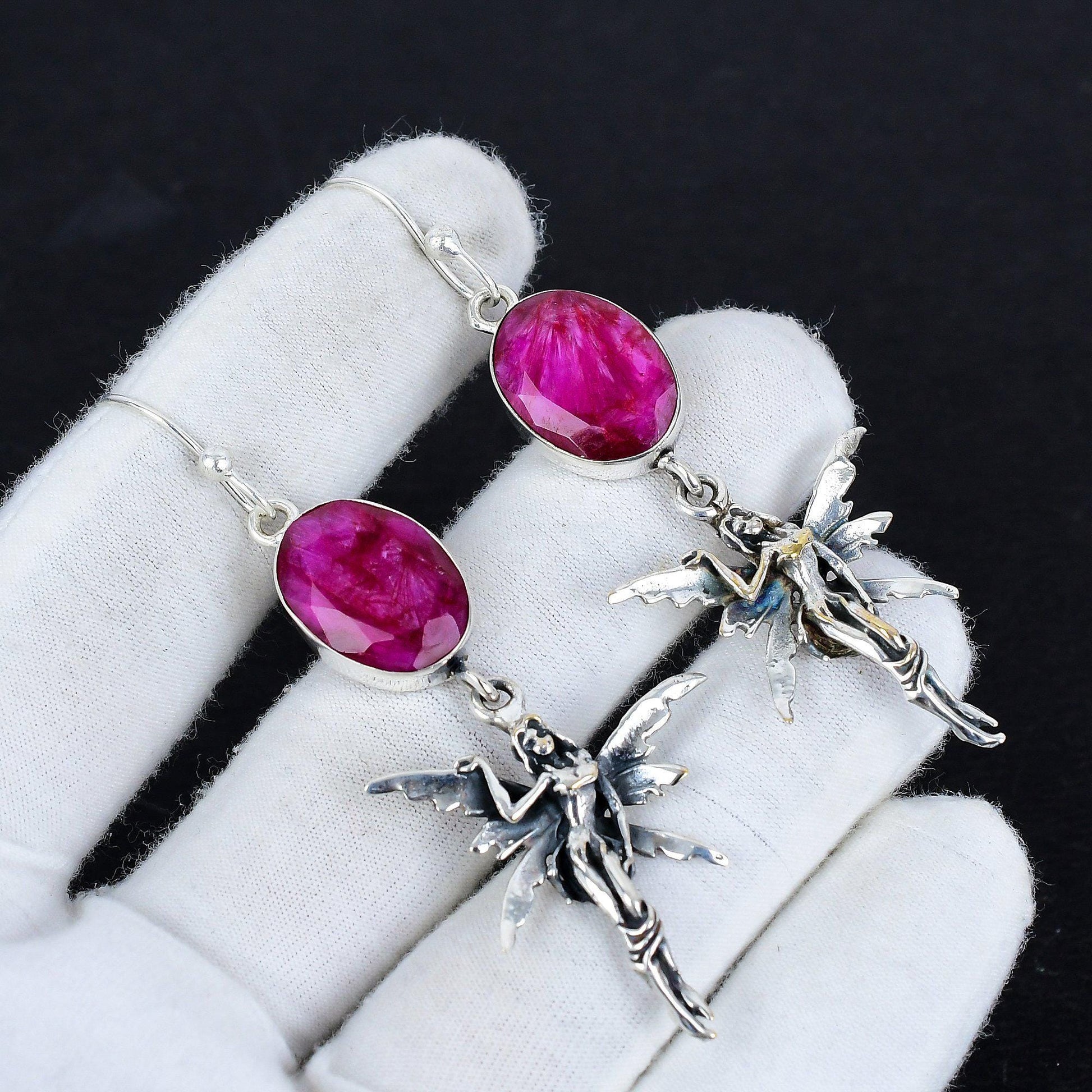 Elevate your style with these exquisite fairy-inspired earrings, featuring vibrant magenta gemstones crafted in a shimmering silver setting.