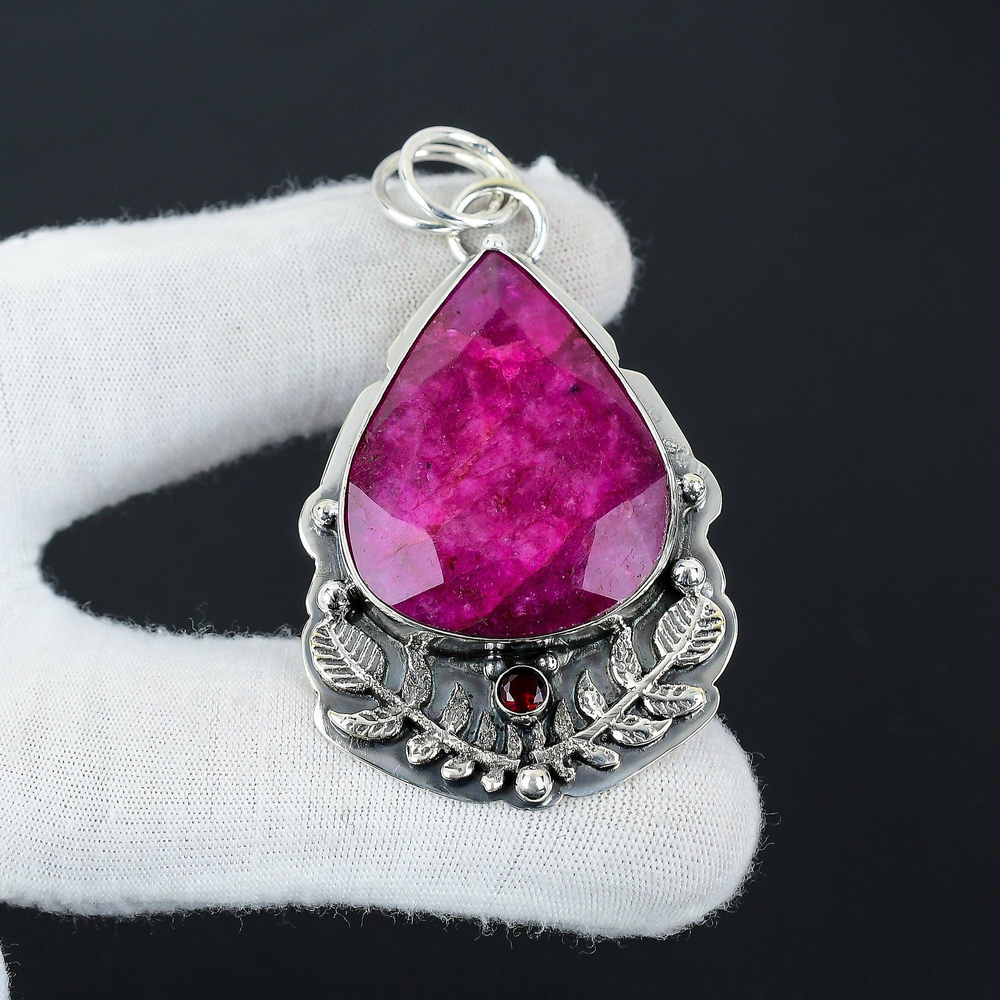 Discover the allure of elegance with our stunning teardrop-shaped pendant, crafted from a vibrant pink gemstone. Enclosed in a meticulously designed silver setting, this piece evokes nature with intricate leaf motifs that cradle the jewel.