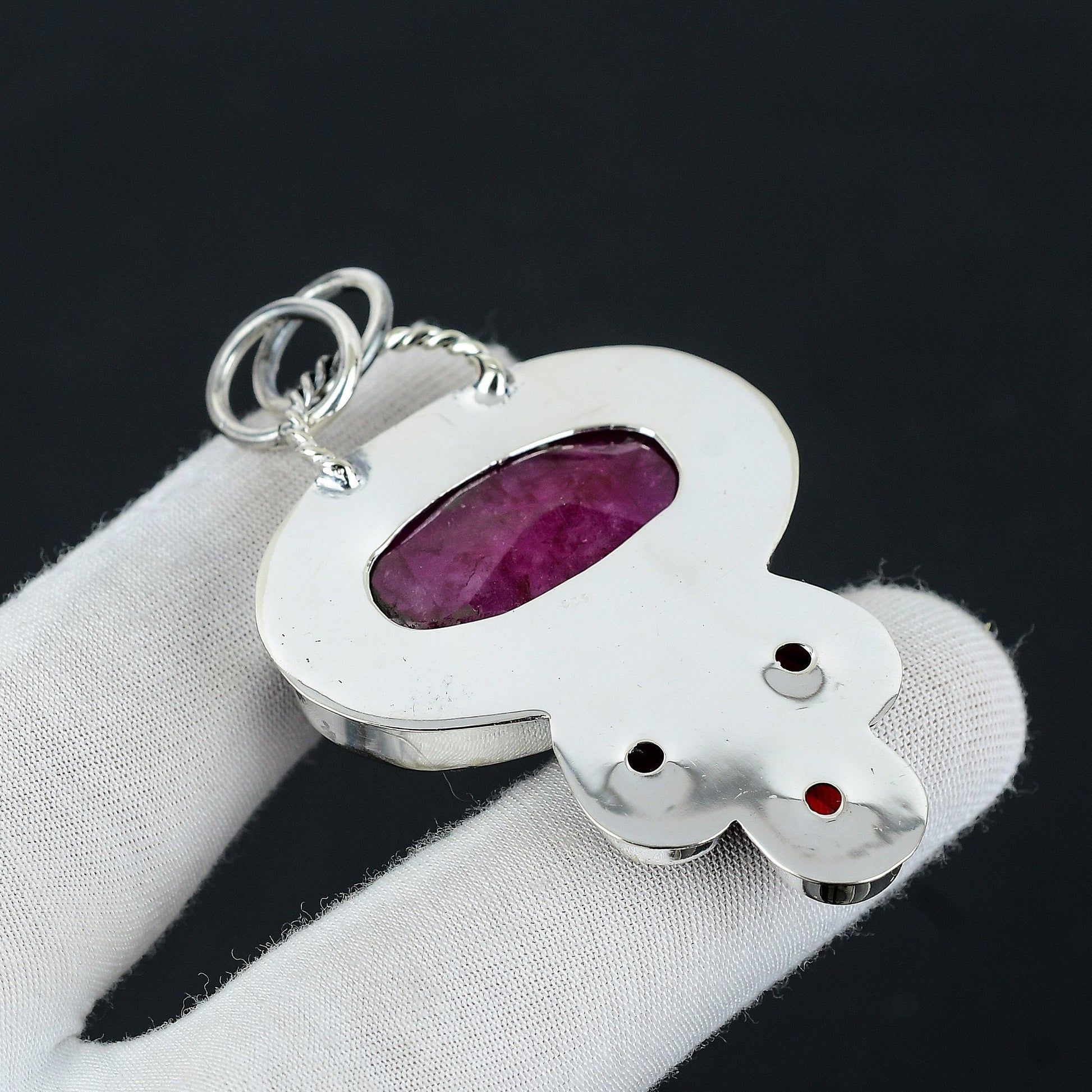 Enhance your elegance with this exquisite handcrafted pendant featuring a stunning oval-cut, deep magenta gemstone. Encased in a sleek silver setting, this captivating centerpiece is complemented by three brilliant red teardrop accents, adding a touch of sophistication and flair.