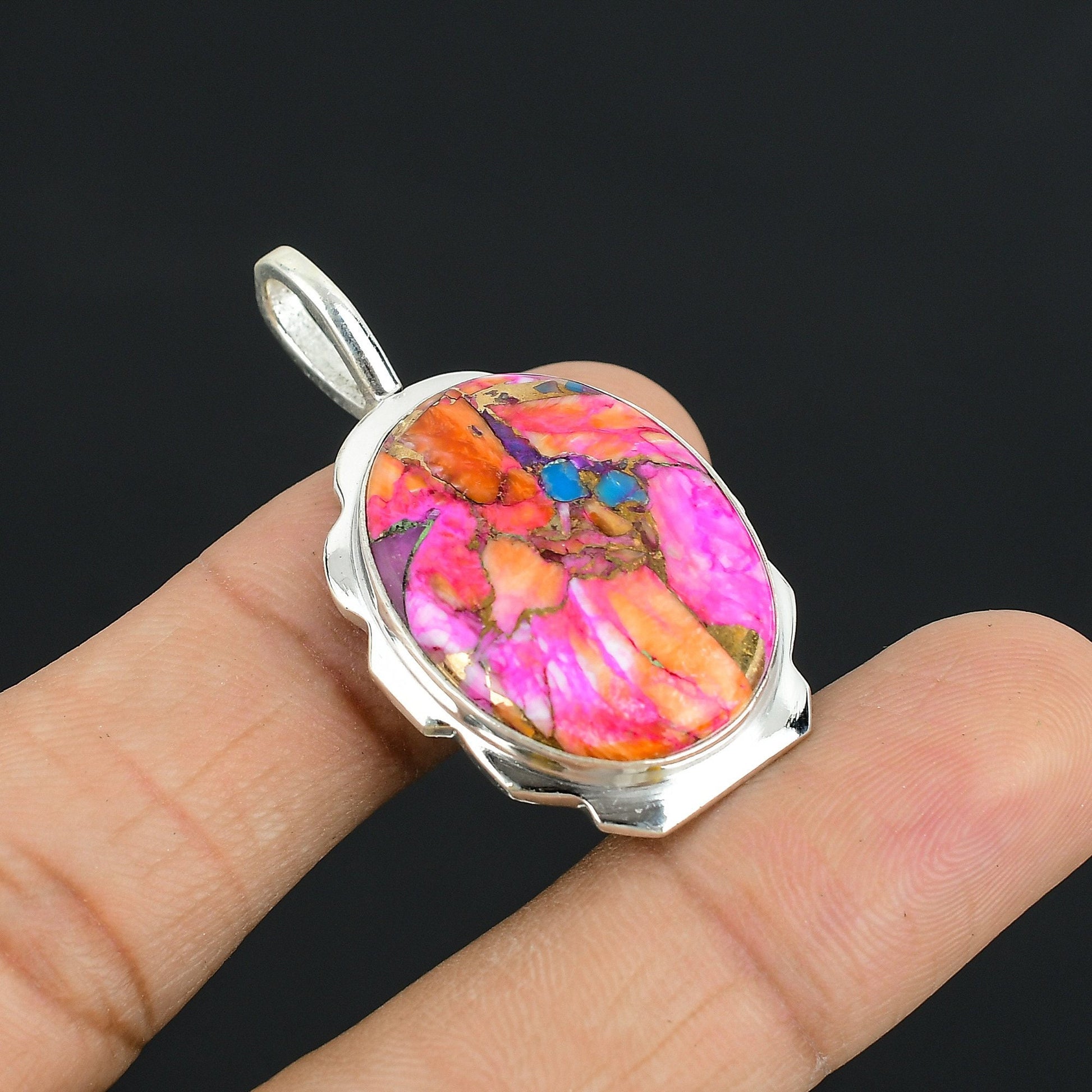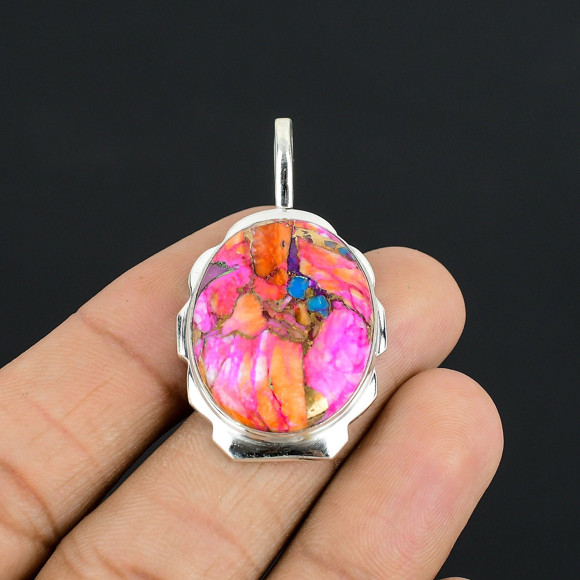 Discover the vibrant allure of our handcrafted pendant, featuring a stunning array of crushed gemstones, including turquoise and spiny oyster shell.
