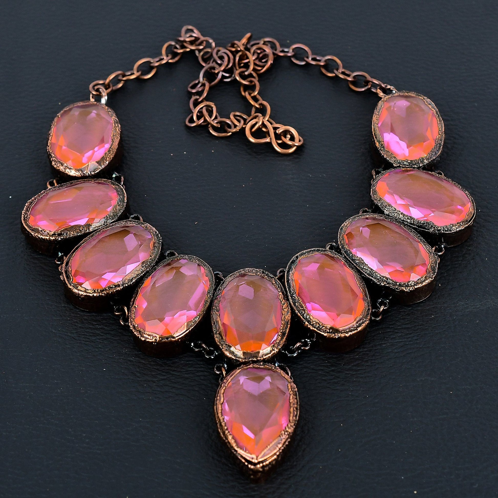 Elevate your style with this exquisite statement necklace, featuring bold, iridescent gemstones that shimmer with shades of pink and orange.