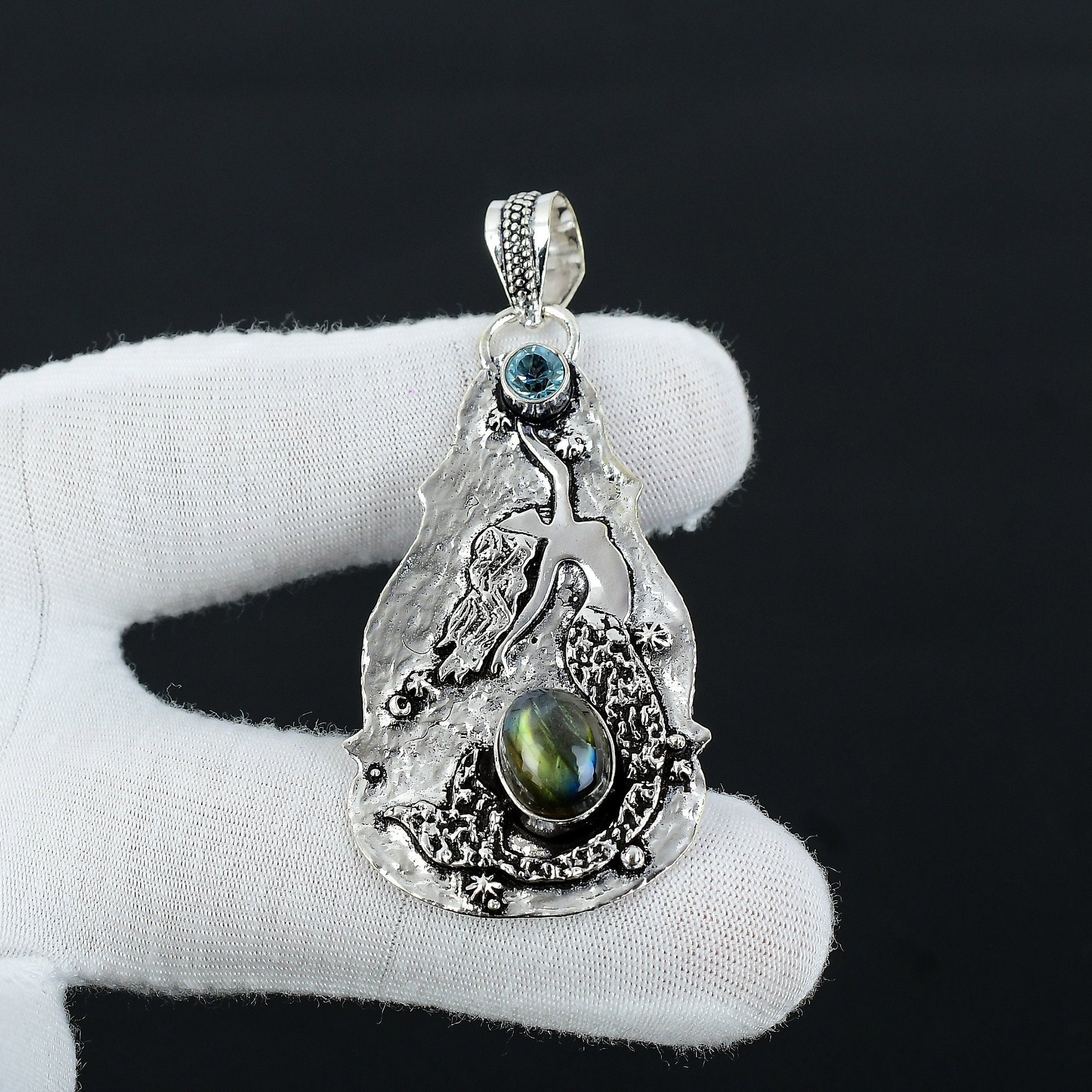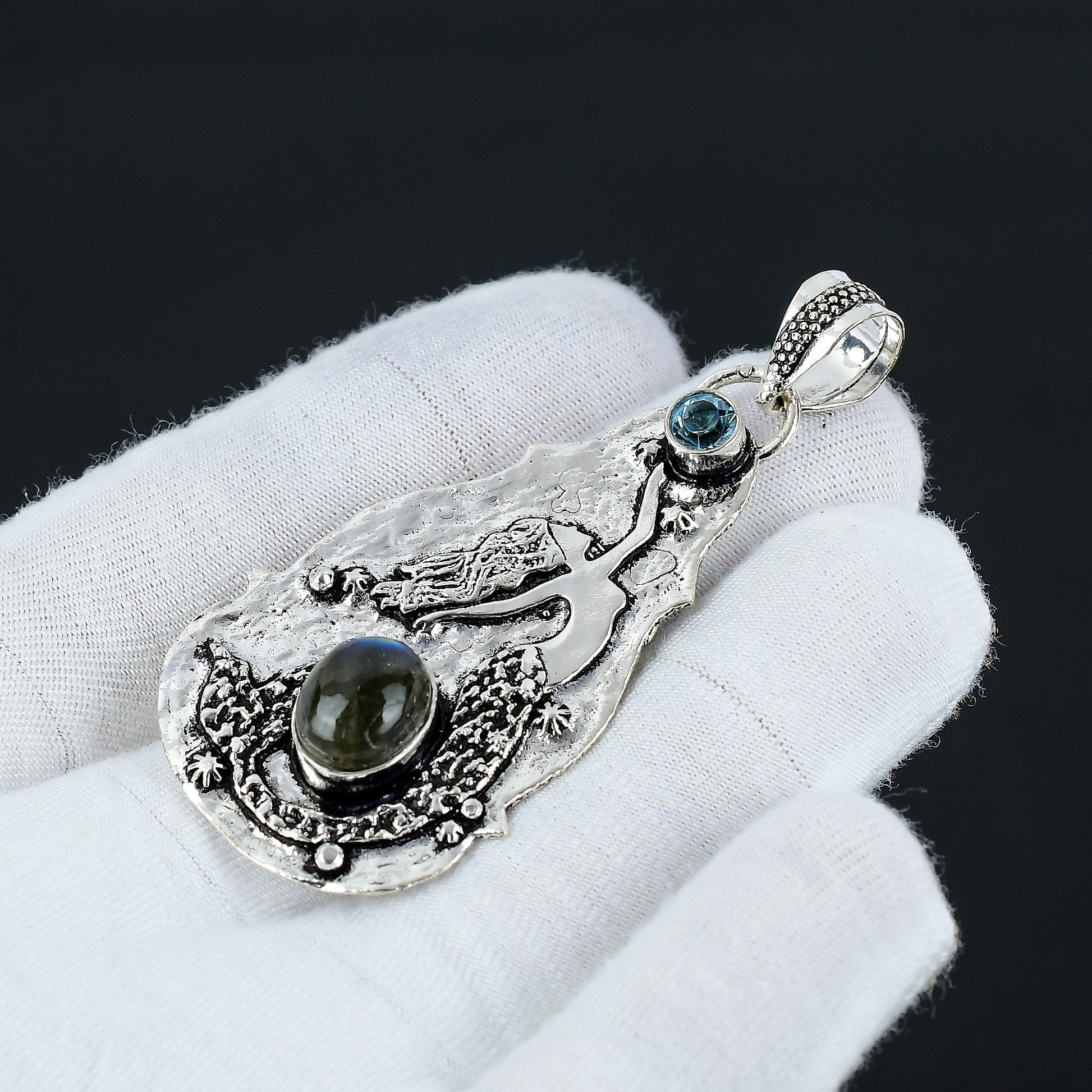 Gemstones: Adorned with a captivating labradorite and a blue topaz, adding a pop of color and elegance.